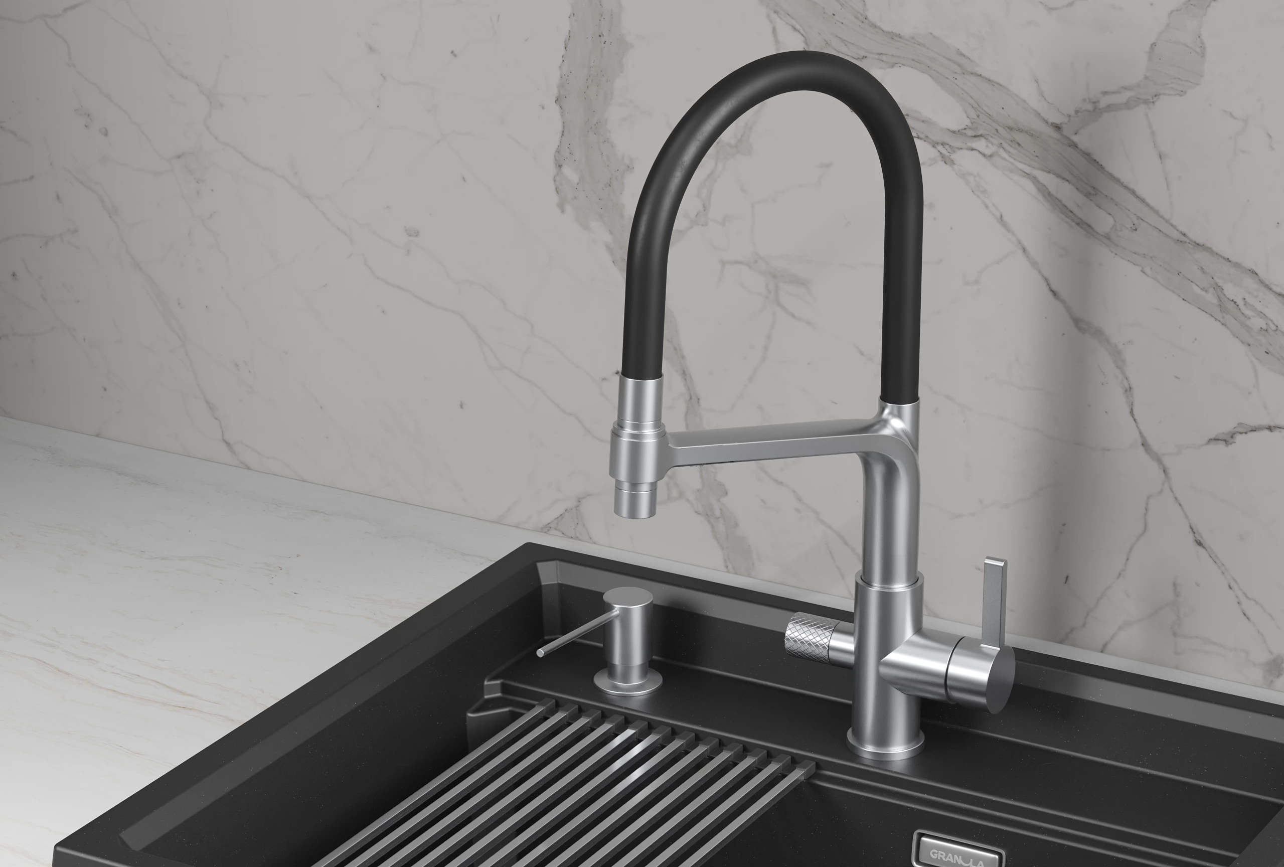 Преобразите свою кухню с помощью этого элегантного смесителя из нержавеющей стали! Он не только станет стильным акцентом в интерьере, но и обеспечит Вас чистой питьевой водой благодаря встроенному подключению к фильтру. Прочная нержавеющая сталь гарантирует долговечность и простоту в уходе, а удобное управление позволит легко настроить температуру и напор.