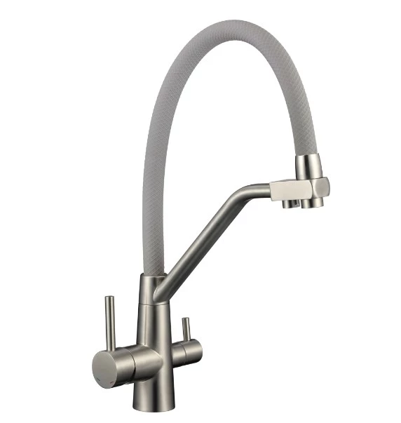 Смеситель для кухонной мойки под фильтр питьевой воды Fmark FS0662-L04 выполнен из качественной нержавеющей стали марки 304. Дизайн смесителя выполнен в цвете сатин с серым гибким изливом. Смеситель отлично будет смотреться в любом интерьере от минималистичного хай-тек до строгой классики. Гибкий излив обеспечивает легкий доступ к раковине, позволяя без труда направлять поток воды в нужную сторону.