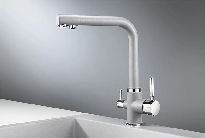 Смеситель для кухонной мойки Granula 2015 изготовлен из высококачественного материала. Латунный корпус обеспечивает длительный срок службы. При этом высокий излив позволяет мыть как мелкую, так и крупногабаритную посуду. Двухрычажная модель смесителя Granula 2015 выполнена с краном для питьевой воды. Фильтрованная вода подается по отдельной трубке и не смешивается с водопроводной водой. Покупателям предлагаются различные типы смесителей, окрашенные в тон моек Granula и StandART. Все модели смесителей для кухонных моек во всех цветах Вы можете посмотреть и приобрести на нашем сайте или в наших представительствах в регионах.