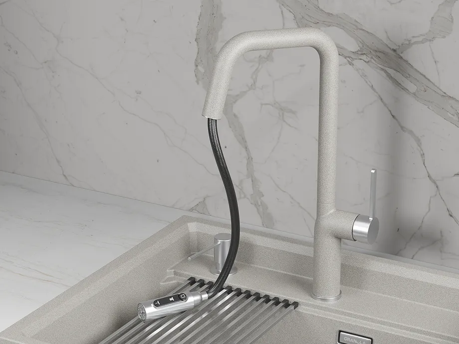 Смеситель оснащен удобным рычажным управлением и поворотным изливом, что обеспечивает легкость в использовании. Выдвижной излив позволяет удобно мыть посуду и наполнять большие кастрюли. Кроме того, предусмотрена возможность подключения к фильтру для чистой питьевой воды.