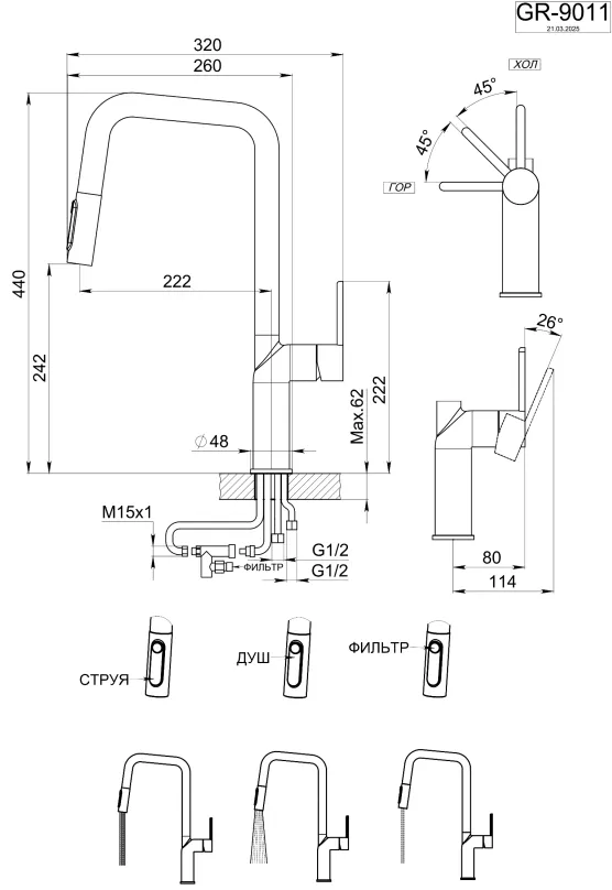 Смеситель оснащен удобным рычажным управлением и поворотным изливом, что обеспечивает легкость в использовании. Выдвижной излив позволяет удобно мыть посуду и наполнять большие кастрюли. Кроме того, предусмотрена возможность подключения к фильтру для чистой питьевой воды.