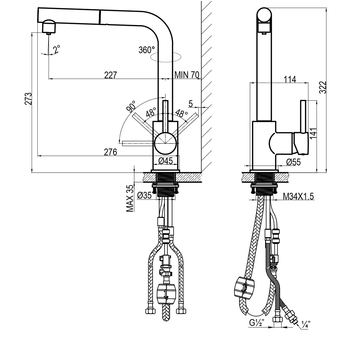Гибкая подводка: ½" 40 см (основная) + ½" 25 см (питьевая).