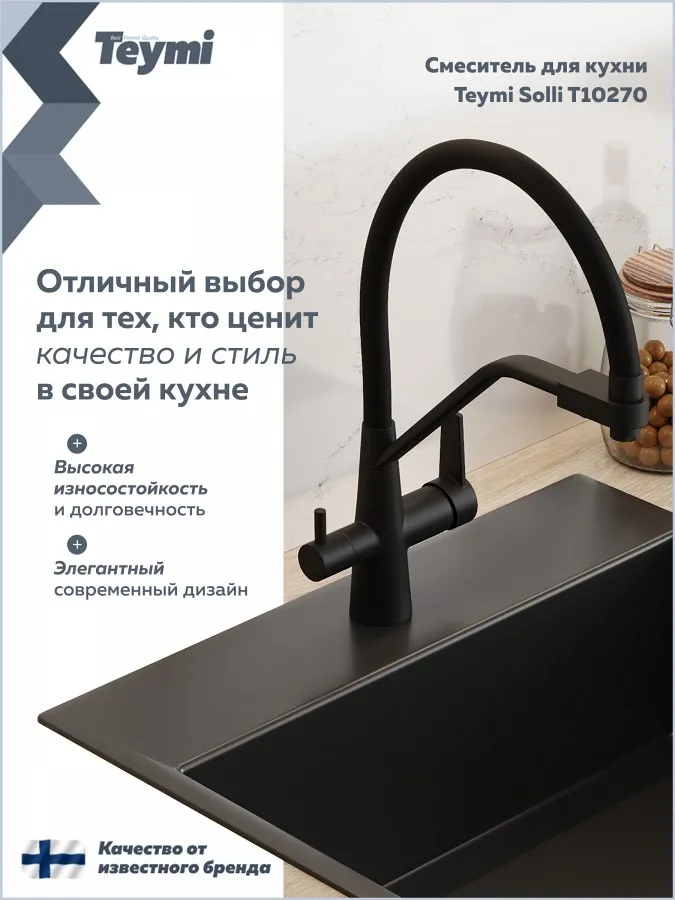 - Teymi Solli T10270 — это надежный и стильный кухонный смеситель, объединяющий функциональность, практичность и финское качество.