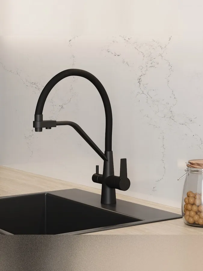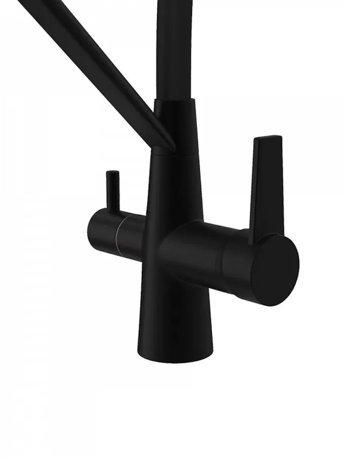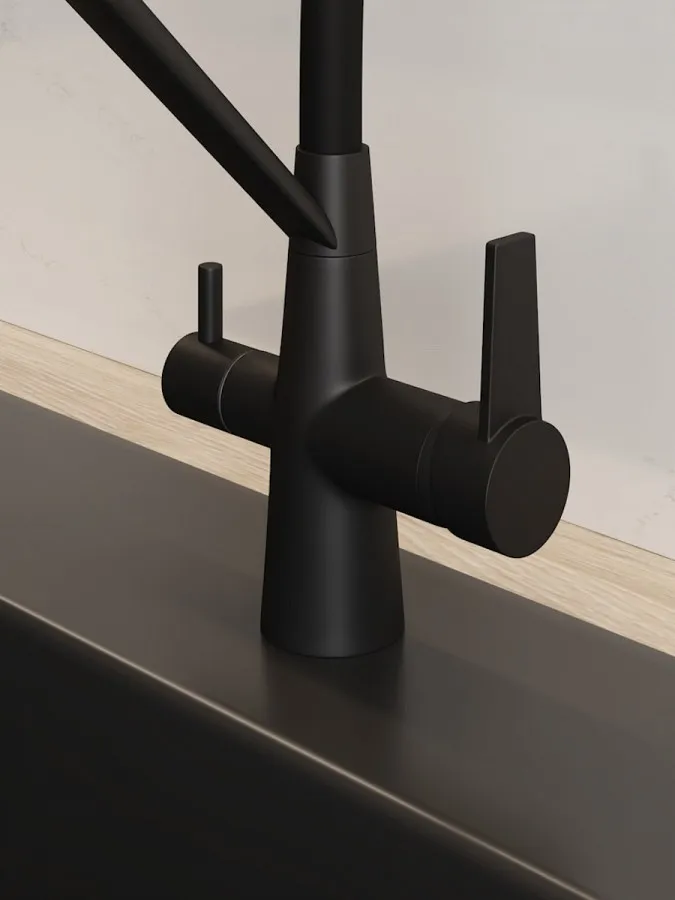 - Главная особенность модели — система 2-в-1 для подачи питьевой воды. Потоки разделены и управляются отдельным рычагом, что позволяет пользоваться как обычной водой, так и фильтрованной без установки дополнительного крана. Такое решение не только экономит место на мойке, но и делает использование максимально удобным.