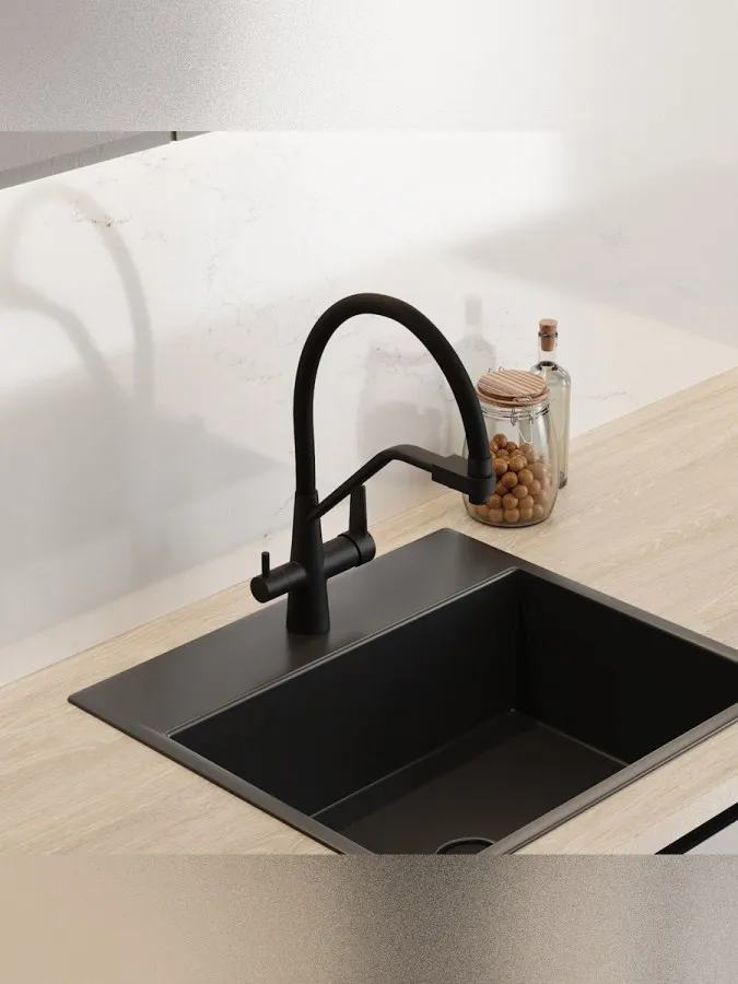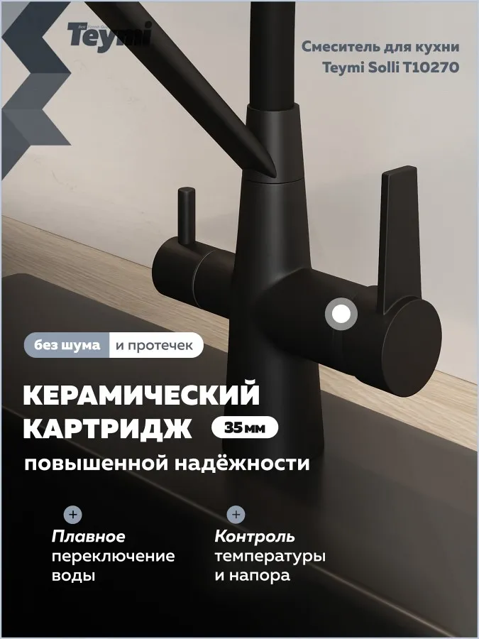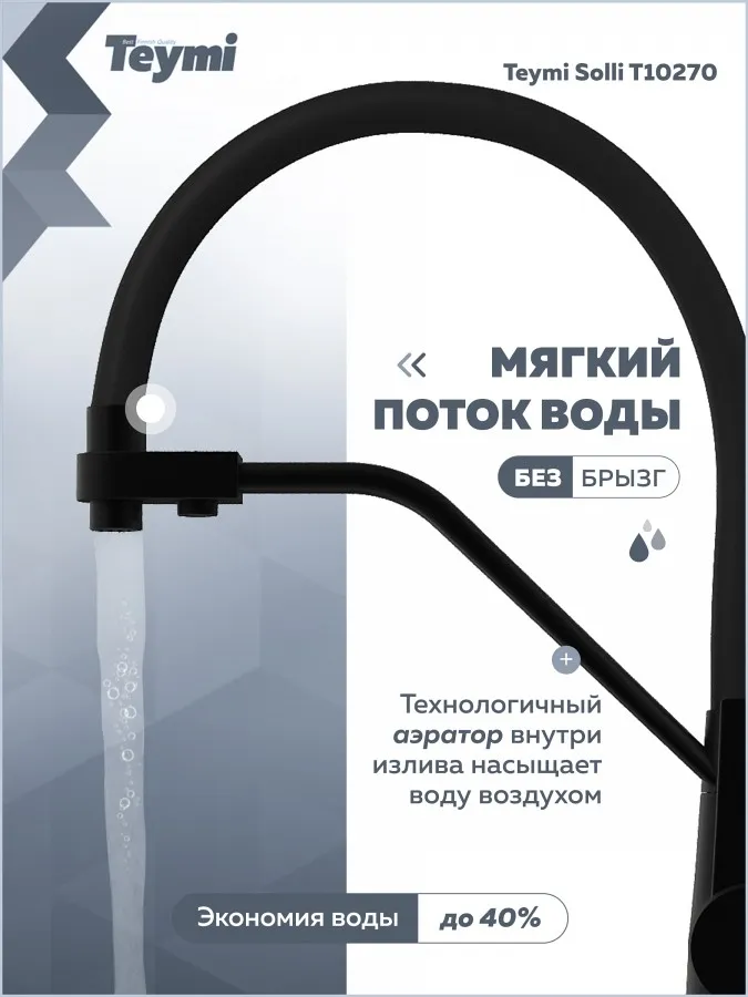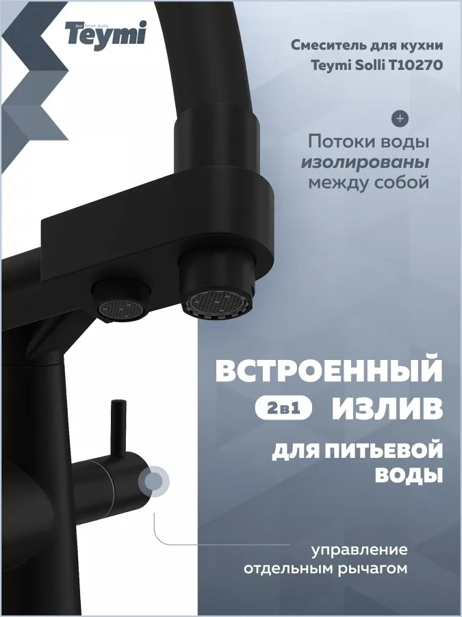 - Смеситель для кухни Teymi Solli T10270 черный матовый — современное решение для тех, кто ценит функциональность, удобство и стиль в каждой детали интерьера. Модель из коллекции Solli сочетает элегантный внешний вид и продуманную конструкцию, обеспечивая комфортное использование в повседневной работе на кухне.
