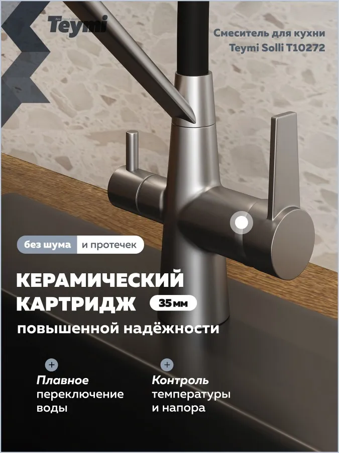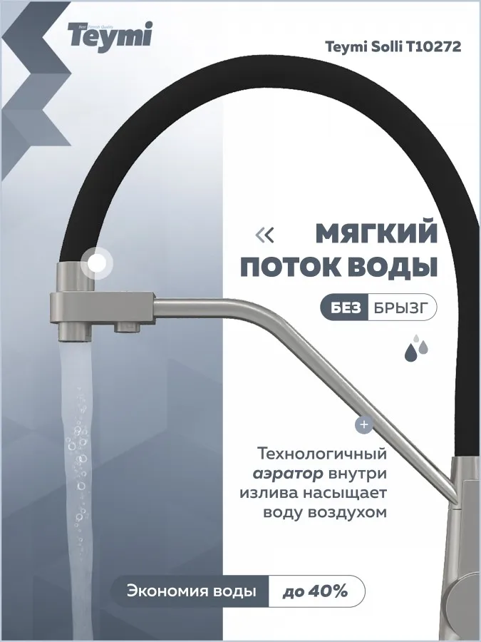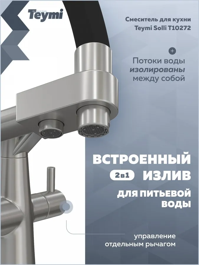 - Teymi Solli T10272 — это надежный и стильный кухонный смеситель, объединяющий функциональность, практичность и финское качество.