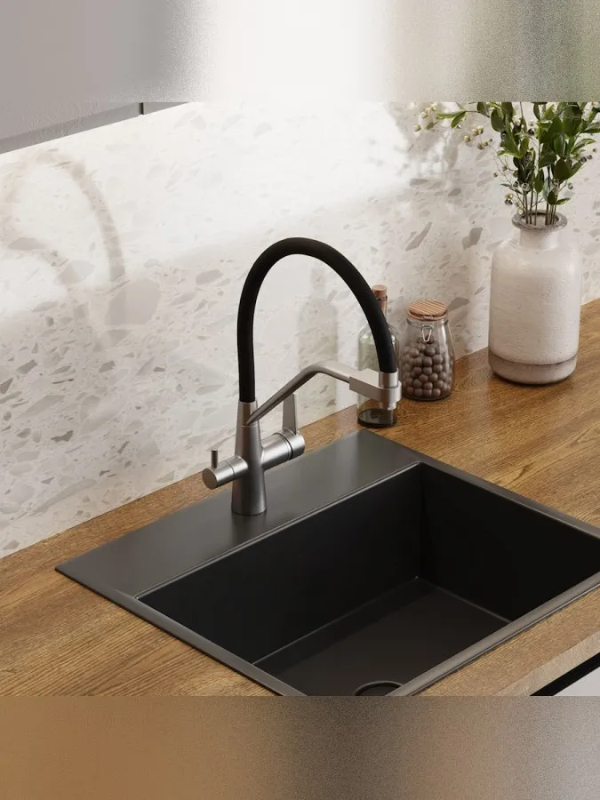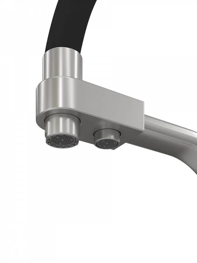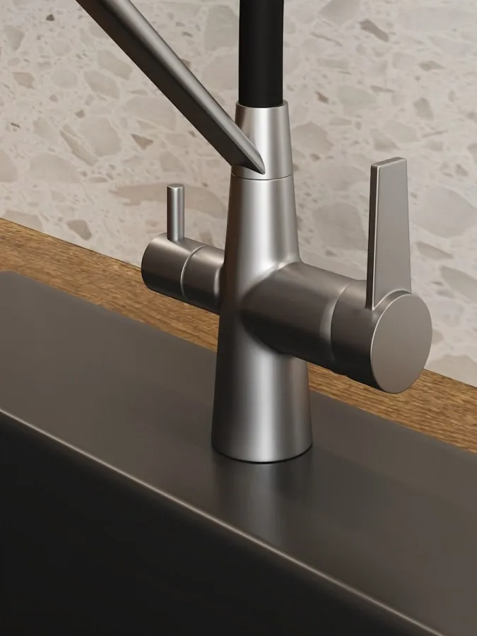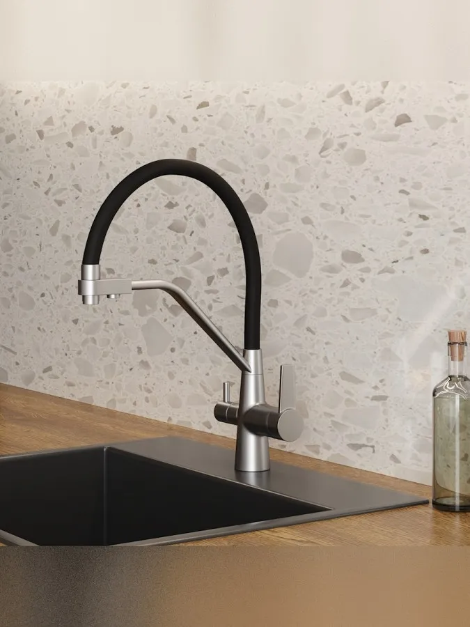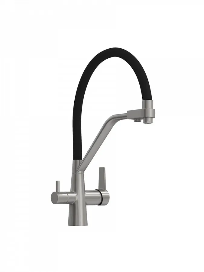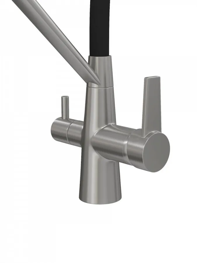 - Главная особенность модели — система 2-в-1 для подачи питьевой воды. Потоки разделены и управляются отдельным рычагом, что позволяет пользоваться как обычной водой, так и фильтрованной без установки дополнительного крана. Такое решение не только экономит место на мойке, но и делает использование максимально удобным.