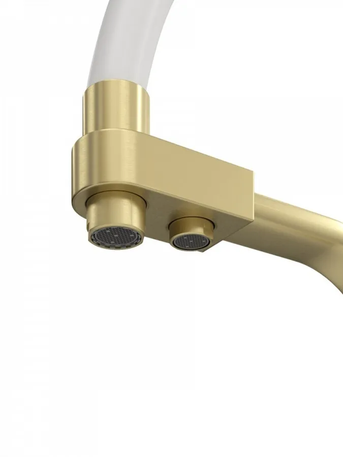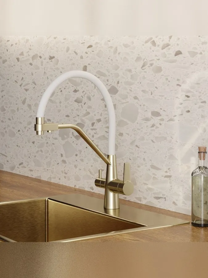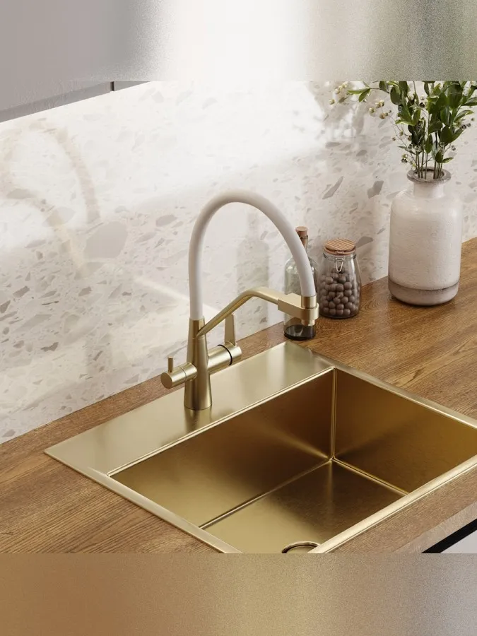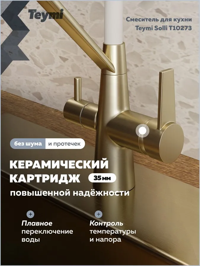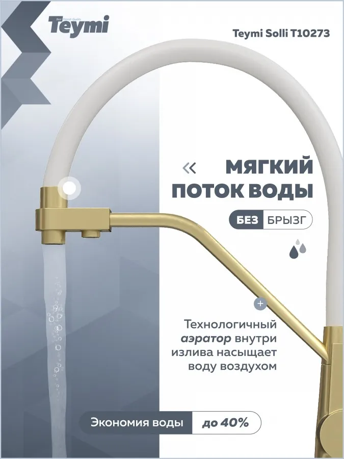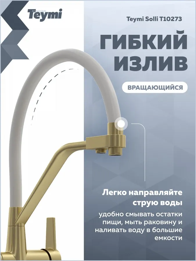 - Смеситель для кухни корпус золото матовый излив белый Teymi Solli T10273 — современное решение для тех, кто ценит функциональность, удобство и стиль в каждой детали интерьера. Модель из коллекции Solli сочетает элегантный внешний вид и продуманную конструкцию, обеспечивая комфортное использование в повседневной работе на кухне.