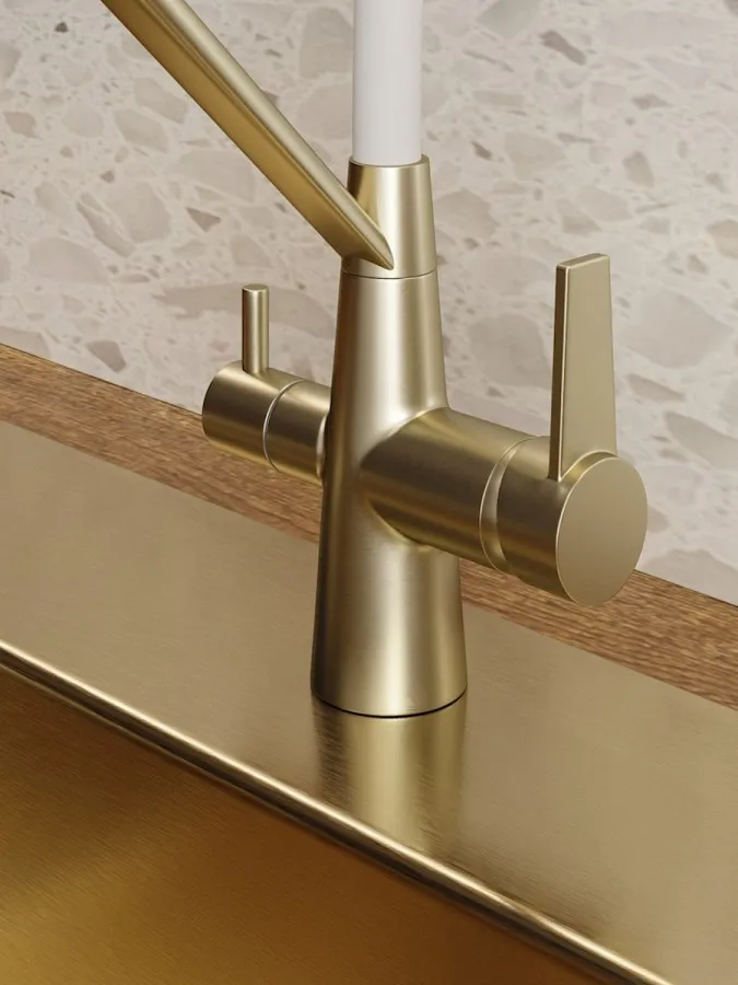- Главная особенность модели — система 2-в-1 для подачи питьевой воды. Потоки разделены и управляются отдельным рычагом, что позволяет пользоваться как обычной водой, так и фильтрованной без установки дополнительного крана. Такое решение не только экономит место на мойке, но и делает использование максимально удобным.
