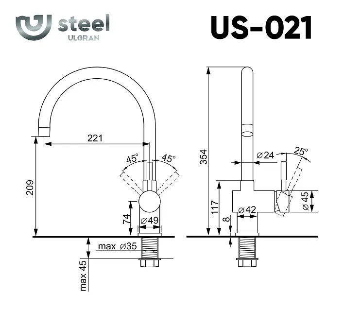 ULGRAN STEEL 021 - однорычажный кухонный смеситель с высоким поворотным изливом. Корпус из высококачественной хирургической стали марки AISI 304 делает смеситель долговечным и устойчивым к коррозии, перепадам давления и температур. Важнейшей особенностью смесителя является то, что цвет идеально совпадает с фирменными цветами моек из нержавеющей стали ULGRAN STEEL и легко подобрать комплект, превратив мойку в настоящий эргономичный центр. В ассортименте имеются цвета "брашированная сталь", "черная брашированная сталь" и "вороненая сталь". В качестве керамического картриджа используется известный бренд Wanhai диаметром 40 мм с высокой пропускной способностью в 500 тысяч циклов "открывания-закрывания". На подвижные части картриджа Wanhai нанесена специальная невымываемая силиконовая смазка, а керамические пластины изготовлены из 96% оксида алюминия, что, в сочетании с высоким качеством шлифовки обеспечивает долговечность, надежность, плавность хода рукоятки. Смеситель оборудован съемным пластиковым аэратором для экономии воды и поворотным изливом на 360 градусов. В комплектацию входят: керамический картридж Wanhai, гибкая подводка 450 мм, комплект крепежных элементов, технический паспорт и гарантийный талон. Заводская гарантия составляет 3 года на материал корпуса, 1 год на комплектующие к смесителю и 1 год на материал покрытия.