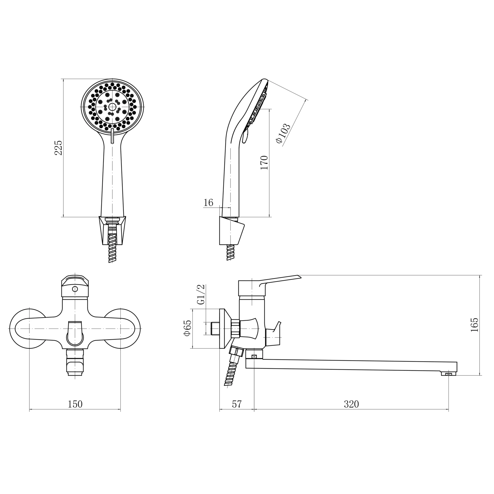 PD22053 смеситель ванно-душевой с душевым гарнитуром хром цинковый сплав, картридж D=35 мм излив: L=320 мм, поворотный установочный комплект + ручная лейка: ABS пластик, D=103 мм, 5 режимов, антикальк держатель настенный: ABS пластик, хром шланг: 1500 мм, оплётка сталь SUS201, хром