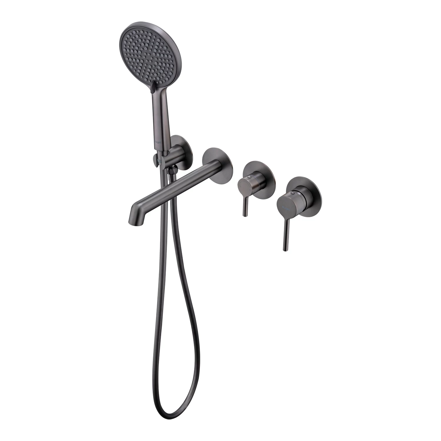Стиль: современный. Цвет: графит. Материал корпуса: латунь. Форма: округлая. Монтаж: встраиваемый. Кол-во отверстий для монтажа: 3. Кол-во отверстий для держателя лейки: 1. Тип управления: одноручковый. Излив: монолитный. Тип дивертора: картриджный переключатель (угол поворота 90°). Душевая лейка: 3-х режимная функциональная лейка. Душевой шланг: силиконовый 1,5 м. Тип подключения: F1/2