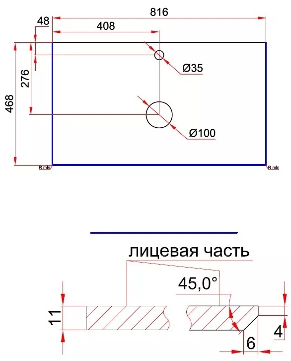 Имеет идеально гладкую и ровную поверхность изготовленную из устойчивых к влажности износу материалов. Столешница керамогранитная в вырезанными отверстиями. Возможна установка любой накладной раковины.