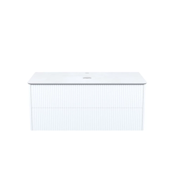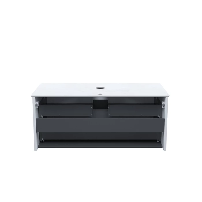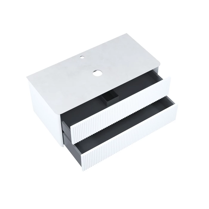 Вместительная подвесная тумба для ванной комнаты Aiger с выдвижными ящиками и столешницей из керамогранита – красивый лаконичный дизайн вне времени с трендовой вертикальной фрезеровкой. Влагостойкая матовая столешница из тонкого сверхпрочного керамогранита стильного цвета «светло-серый бетон» повторяет радиус скругления угла тумбы. Край филигранно запилен под 45 градусов и отполирован до глянцевого блеска – выглядит эстетично и при этом безопасен. Простая в монтаже – с готовыми отверстиями под смеситель и раковину. Влагостойкие фасады и боковины из МДФ с покрытием ПВХ-пленкой с приятным тактильным эффектом soft touch прослужат долго. Интегрированные фасады имеют скругление – выглядят красиво и безопасны для детей. Вместительные ящики с внутренней отделкой в практичном графитовом цвете – стильный внешний вид и много места для хранения. Эргономичная пластиковая защита сифона. Бесшумные направляющие для ящиков и надежные подвесы Hettich – высокое качество и беззаботная эксплуатация долгие годы. Ящики мягко открываются за счет механизма Push-to-Open – удобные и легкие в повседневной эксплуатации. Открываются нажатием на фасад. Сифон приобретается отдельно.
