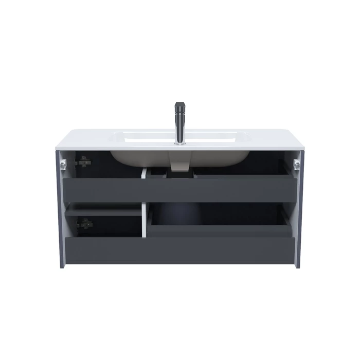 Вместительная подвесная тумба с плоским умывальником Edifice стильного темно-серого цвета – воплощение современного минимализма. Мягкие линии корпуса в сочетании с удобными интегрированными ручками выглядят свежо и актуально. Смотрится аккуратно, легко и не усложняет процесс уборки в ванной благодаря подвесной конструкции.
