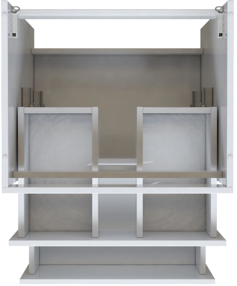 - Фасад ЛДСП 16 мм в эмали (белая), корпус ВЛДСП 16 мм, некрашеный. Интегрированные ручки.