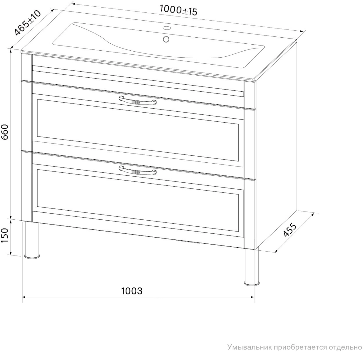 - Размеры тумбы (с ножками): 455х1003х810 мм (ДхШхВ).
