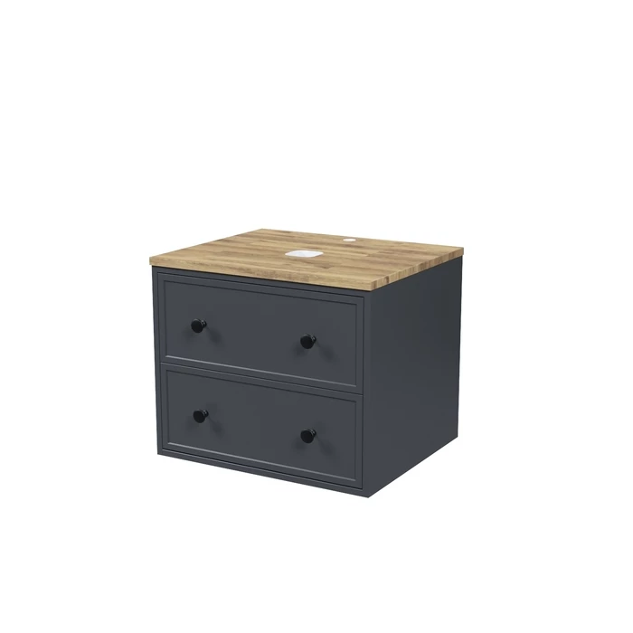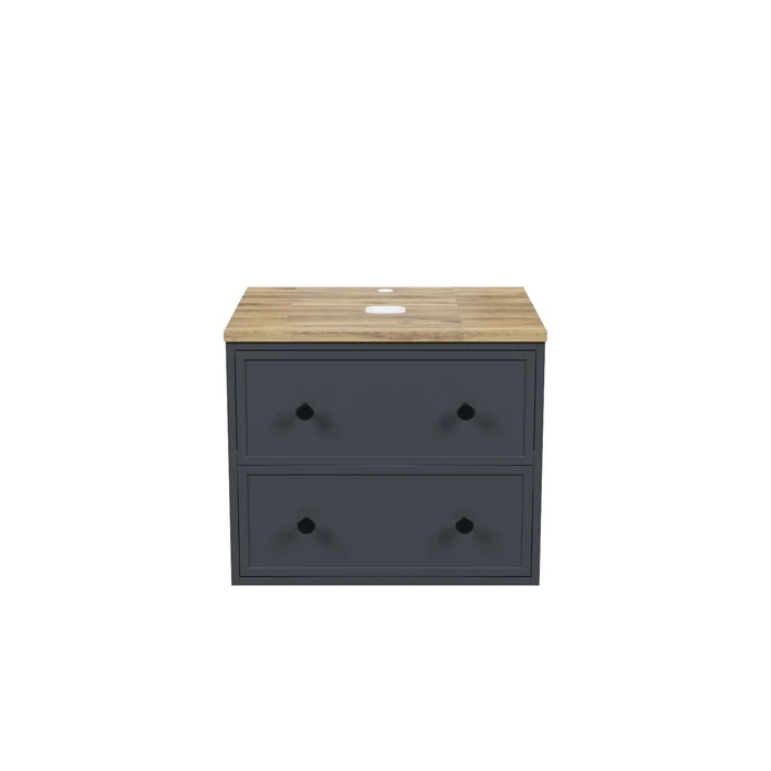 Компактная подвесная тумба Torr трендового темно-серого цвета со столешницей из клееного натурального дуба. Сочетает в себе узнаваемый стиль и практичность популярного скандинавского дизайна. Ее четкие формы, теплый цвет дерева, фасады с декоративной филенкой, круглые ручки смотрятся гармонично и впишутся в любой современный интерьер. Подойдет любой накладной умывальник, покупается отдельно.