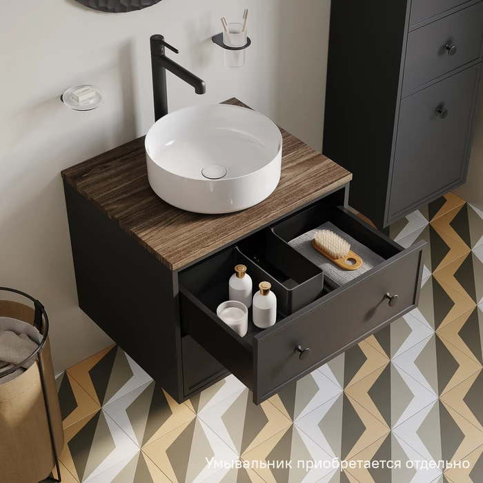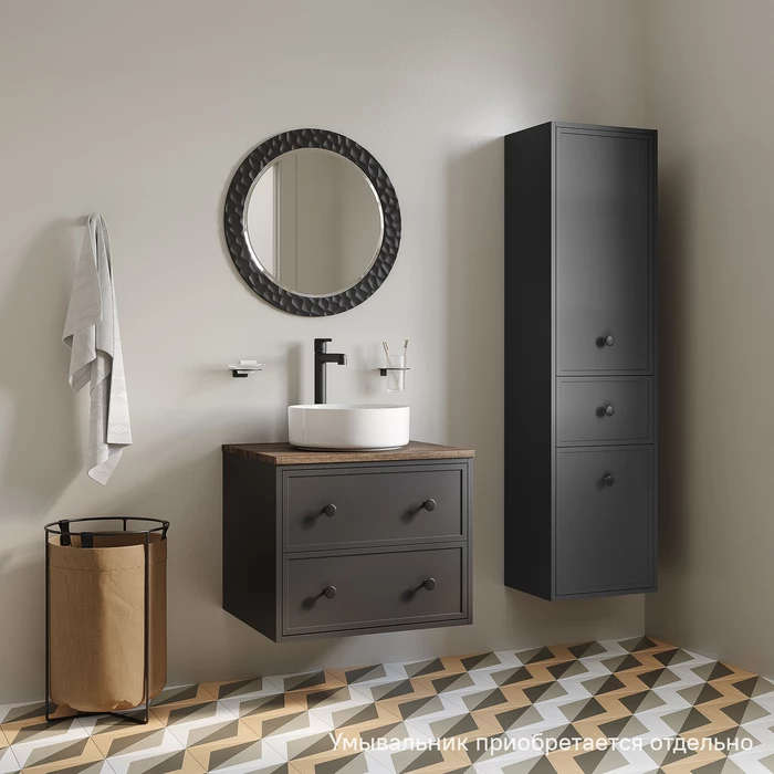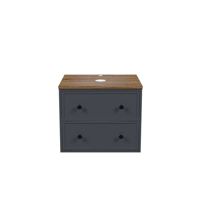 Компактная подвесная тумба Torr трендового темно-серого цвета со столешницей из МДФ в оттенке ореха макадамия. Сочетает в себе узнаваемый стиль и практичность популярного скандинавского дизайна. Ее четкие формы, теплый цвет дерева, фасады с декоративной филенкой, круглые ручки смотрятся гармонично и впишутся в любой современный интерьер. Подойдет любой накладной умывальник, покупается отдельно.