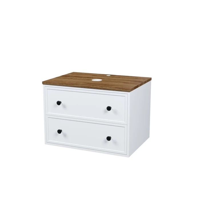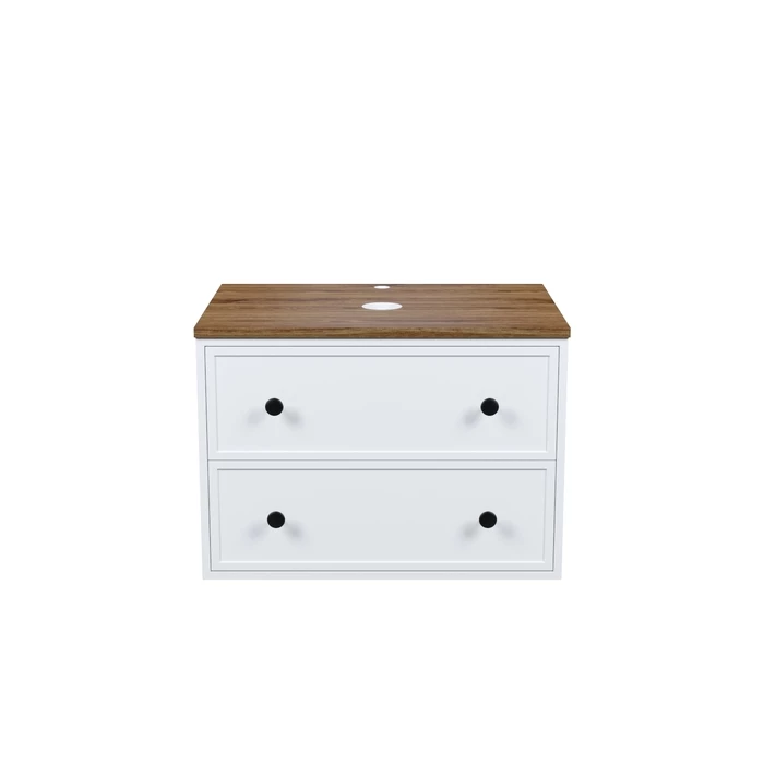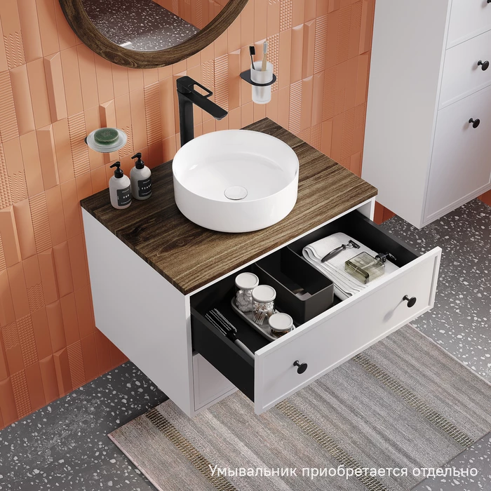 Вместительная подвесная тумба Torr классического молочно-белого цвета со столешницей из МДФ в оттенке ореха макадамия. Сочетает в себе узнаваемый стиль и практичность популярного скандинавского дизайна. Ее четкие формы, теплый цвет столешницы, фасады с декоративной филенкой, круглые ручки смотрятся гармонично и впишутся в любой современный интерьер. Подойдет любой накладной умывальник, покупается отдельно.Два просторных выдвижных ящика закрываются плавно и бесшумно благодаря высококачественным скрытым направляющим с доводчиками Hettich. Внутри ящики графитового цвета – стильно и практично.Многослойное покрытие матовой эмалью, предназначенной для использования в помещениях с высокой влажностью, позволит сохранить первоначальный вид мебели надолго (при должном уходе).Надежная фурнитура Hettich рассчитана на 30 000 открываний – это более 10 лет исправной работы. Гарантия на мебель IDDIS® – 3 года.