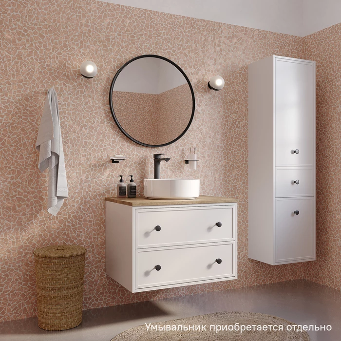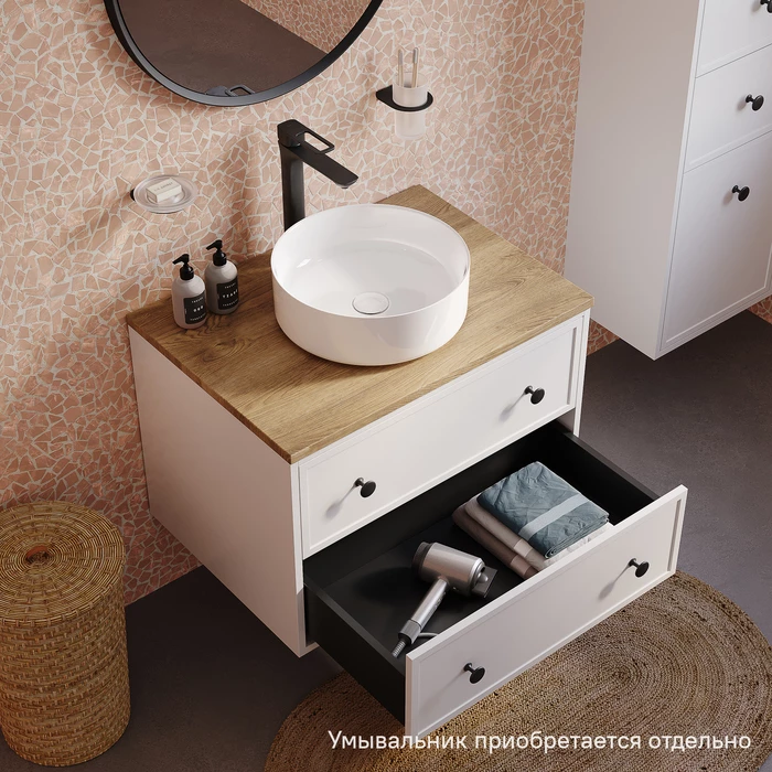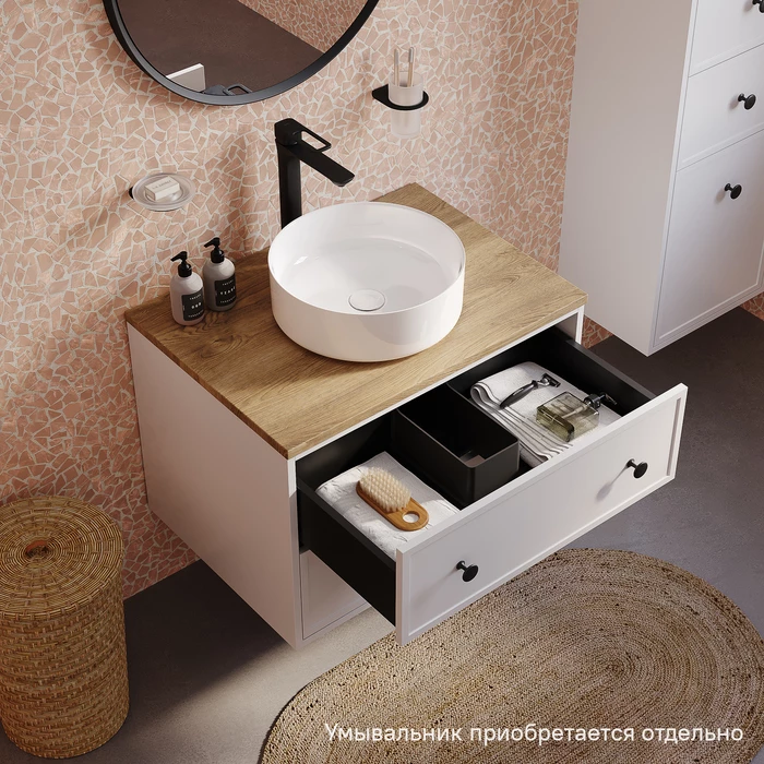 Два просторных выдвижных ящика закрываются плавно и бесшумно благодаря высококачественным скрытым направляющим с доводчиками Hettich. Внутри ящики графитового цвета – стильно и практично. Многослойное покрытие матовой эмалью, предназначенной для использования в помещениях с высокой влажностью, позволит сохранить первоначальный вид мебели надолго (при должном уходе).
