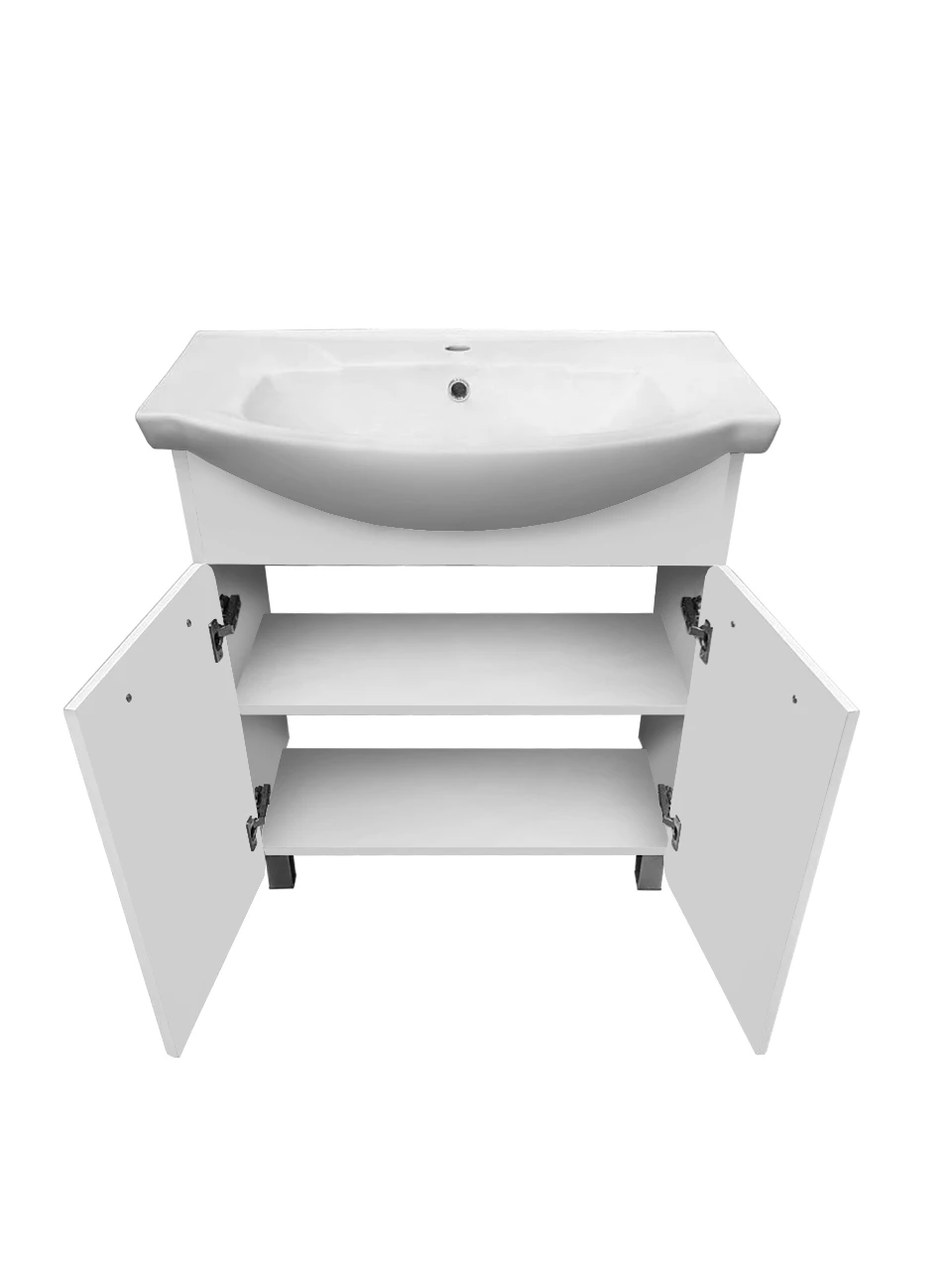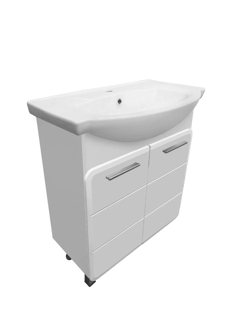 Тумба под раковину ЭРИКА - современный и стильный дизайн в оформлении ванной комнаты. Тумба под раковину ЭРИКА (напольная), выполненная в белом цвете с глянцевым покрытием, инкрустированная квадратной фрезеровкой на фасадах, превосходно украсит любой интерьер ванной комнаты. Тумба в ванную комнату имеет две распашные дверцы и одну встроенную полку. В комплекте к тумбе идут 2 ручки, петли со встроенным доводчиком, 2 хромированные и 2 пластиковые ножки. К тумбе для ванной комнаты подходит керамическая раковина "Элеганс 75" (760*450 мм). Раковина имеет глубину 19,5 см. Мебель для ванной RUNO - красота и практичность в мелочах!