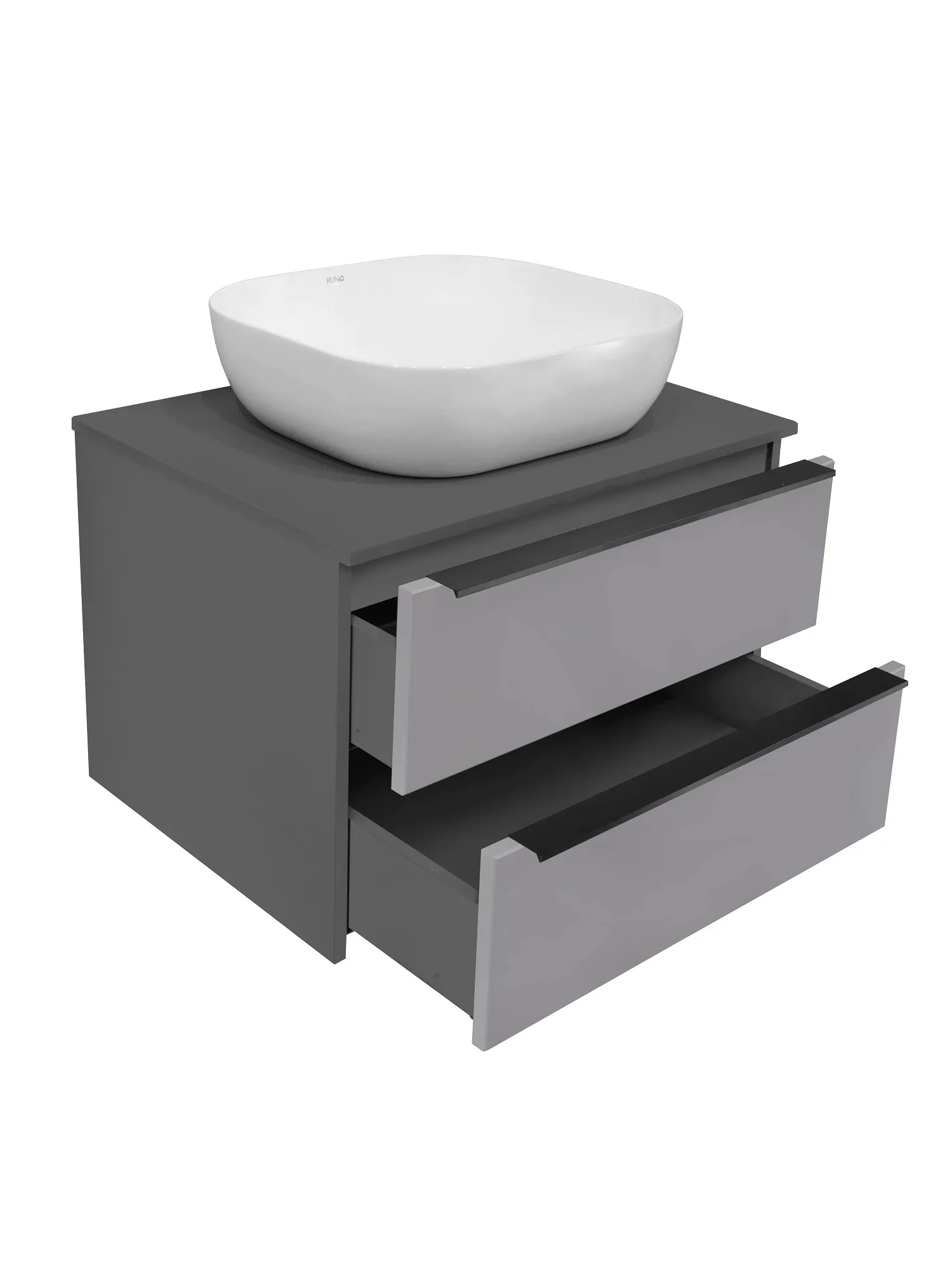 Тумба под раковину Мальта - дизайнерское решение для оформления ванной комнаты. Тумба под раковину Мальта (подвесная) - это стильное сочетание серого фасада с темно-серым корпусом. Тумба в ванную имеет два выдвижных ящика на направляющих скрытого монтажа, оснащенных системой плавного закрывания. В комплекте идут: две металлических ручки, навесы для крепления к стене. К тумбе для ванной комнаты подходят любые накладные керамические раковины бренда RUNO. Мебель для ванной RUNO - красота и практичность в мелочах!