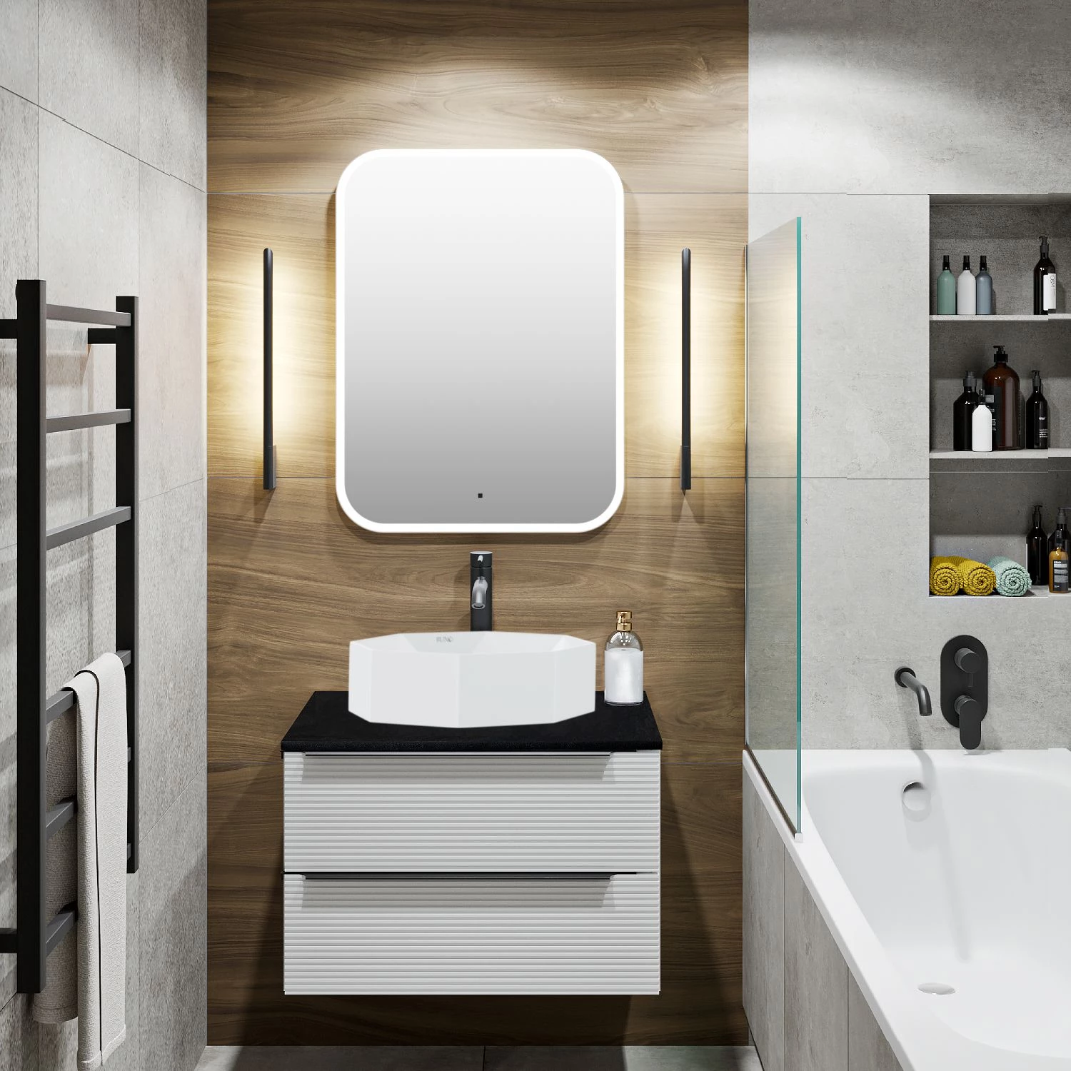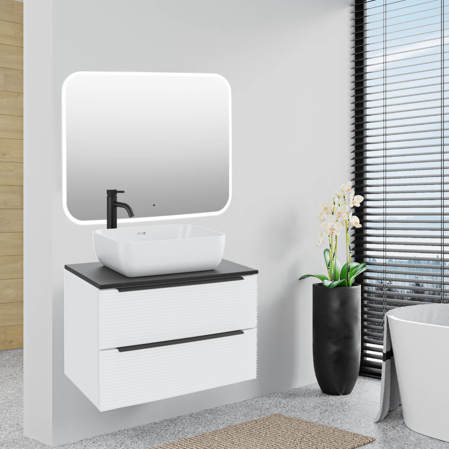 Тумба под раковину в ванную RUNO Орлеан (подвесная) – это изысканность и утончённая роскошь в интерьере. Рифленые фасады визуально «оживляют» и «приводят в движение» всю обстановку комнаты, сохраняя при этом умиротворение и покой. Цвета корпуса и фасада имеют идеальное классическое цветовое сочетание белого и чёрного цветов, которые идеально впишутся в любой интерьер ванной комнаты. Тумба в ванную оснащена двумя выдвижными ящиками на направляющих скрытого монтажа, оборудованных системой плавного закрывания. В комплекте входят: две металлические ручки, навесы для крепления к стене. К тумбе для ванной подойдут умывальники на столешницу: «OVALE 50» (50х36см) - идеальное решение для стильного интерьера ванной, создан для минималистичных интерьеров и подойдёт для санузлов в стиле лофт, минимализм и хай-тек. Строгая овальная геометрически правильная форма раковины, усиливает идею лаконичности в дизайне, устанавливается на столешницу, накладным методом. «PALLA D41» (диаметр 41см) - идеальное решение для стильного интерьера ванной, создан для минималистичных интерьеров и подойдёт для санузлов в стиле лофт, минимализм и хай-тек. Строгая круглая геометрически правильная форма раковины, усиливает идею лаконичности в дизайне, устанавливается на столешницу, накладным методом. «TRE 48» (48х37см) - идеальное решение для стильного интерьера ванной, создан для минималистичных интерьеров и подойдёт для санузлов в стиле лофт, минимализм и Хай-Тек. Строгая прямоугольная форма с округлыми углами усиливает идею лаконичности в дизайне, устанавливается на столешницу, накладным методом. И другие накладные раковины бренда RUNO.