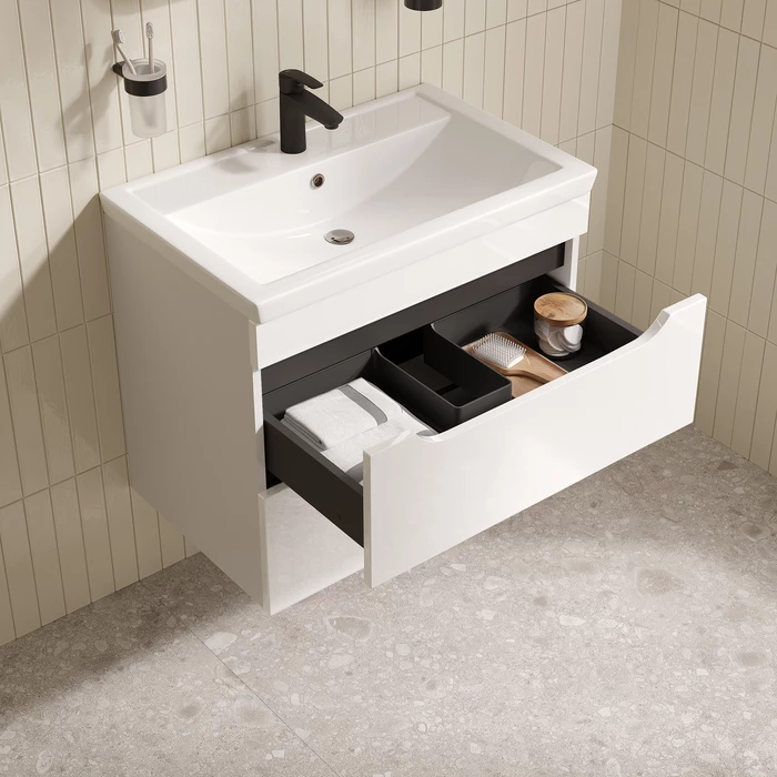 Подвесная тумба для ванной Ray с умывальником и выдвижными ящиками – универсальная и практичная мебель, которая будет отлично смотреться в любом современном интерьере. Сочетание белого цвета, светло-серых элементов фасада и тёмно-серых ящиков создаёт стильный дизайн вне времени. У тумбы увеличенная высота, что делает её более вместительной и удобной. Материал фасадов – МДФ 16 мм, максимально устойчивый к влаге. Детали из МДФ полностью окрашены водостойкой глянцевой эмалью Сarpoly в 6 слоёв внутри и снаружи, что обеспечивает долговечное и износостойкое покрытие сроком службы более 15 лет во влажном помещении ванной (при соблюдении рекомендаций по уходу). Керамический умывальник с большой глубокой чашей – практично для гигиенических и хозяйственных нужд. Готовое отверстие под смеситель D=34 мм. Пластиковая защита сифона внутри ящиков увеличивает долговечность и влагостойкость тумбы. Лаконичные интегрированные ручки для комфортного хвата рукой с прокрашенным фрезерованным контуром – удобны в эксплуатации и более долговечны, чем классические мебельные ручки. Выдвижные ящики открываются захватом за фасад и благодаря механизму плавного доведения закрываются плавно и бесшумно. Фурнитура рассчитана на 30 000 открываний, что составляет более 10 лет исправной работы. Ящики полностью выдвигаются, что делает их очень удобными в использовании. Гарантия на мебель IDDIS® – 3 года, на умывальник – 25 лет.