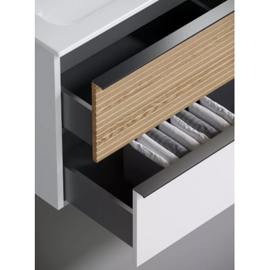 - Тумба подвесная SANCOS Delta 995х445х500, c двумя ящиками оснащенными доводчиками скрытого монтажа с системой Soft close (плавного закрывания), ручки чёрные профильные накладные, правая, дуб светлый/белый , арт. DL100RW