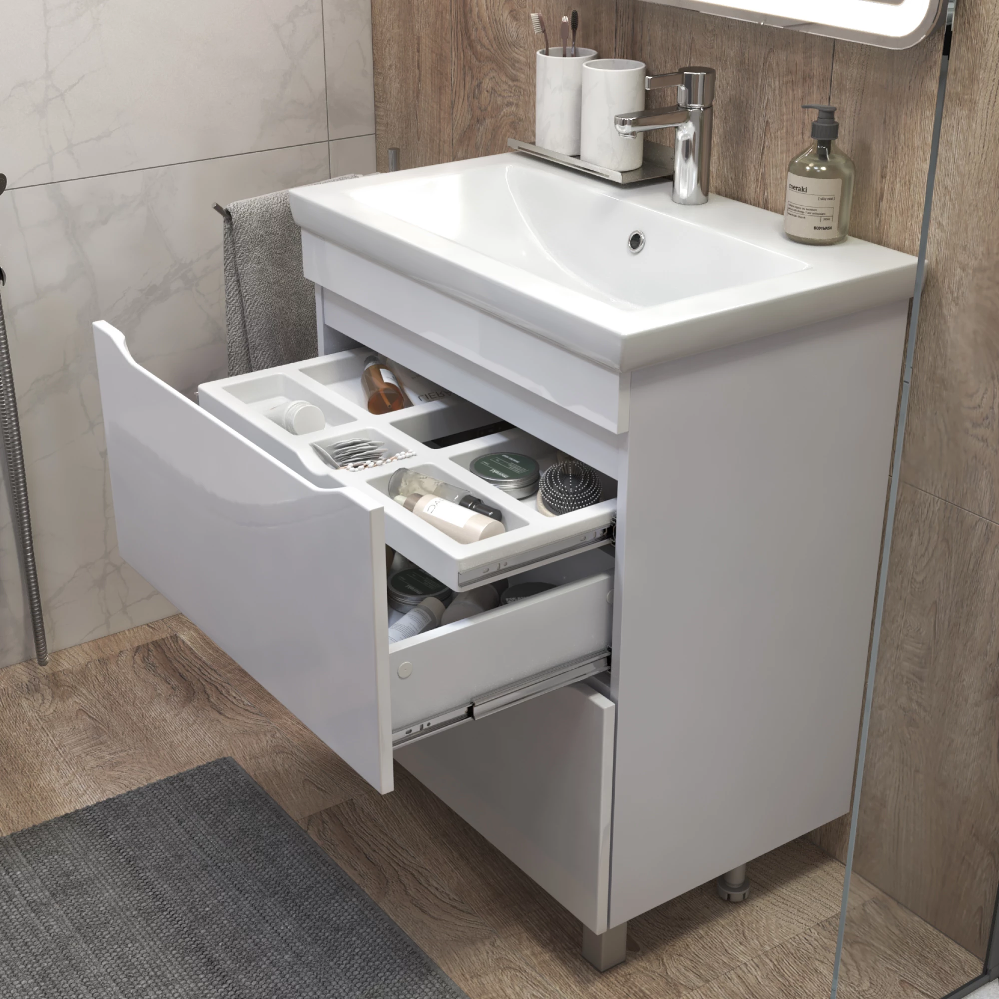 Комплектация: 2 ящика, выдвижной органайзер для мелочей, направляющие шариковые полного выдвижения, 2 опоры квадратные регулируемые; 2 кухонные опоры, 1 сифон