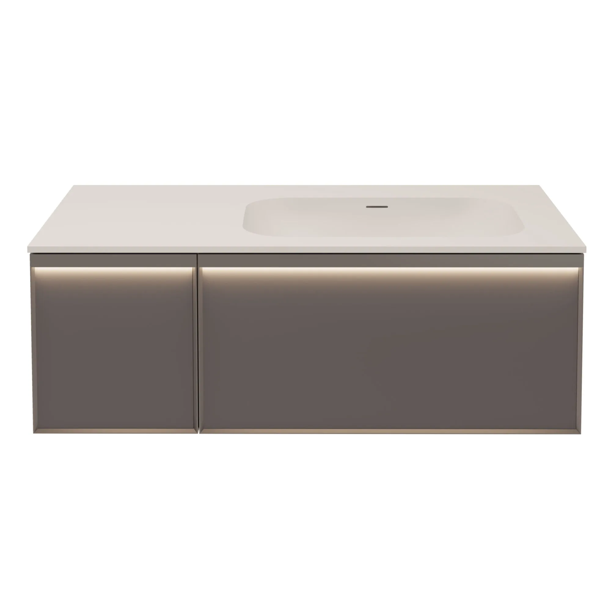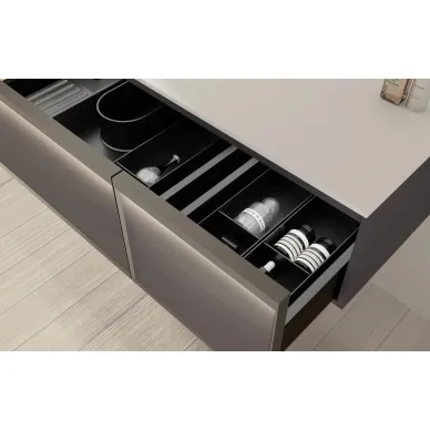 - Передняя часть выдвижного ящика c алюминиевым профилем в цвете вороненая сталь скошена под углом 45°;