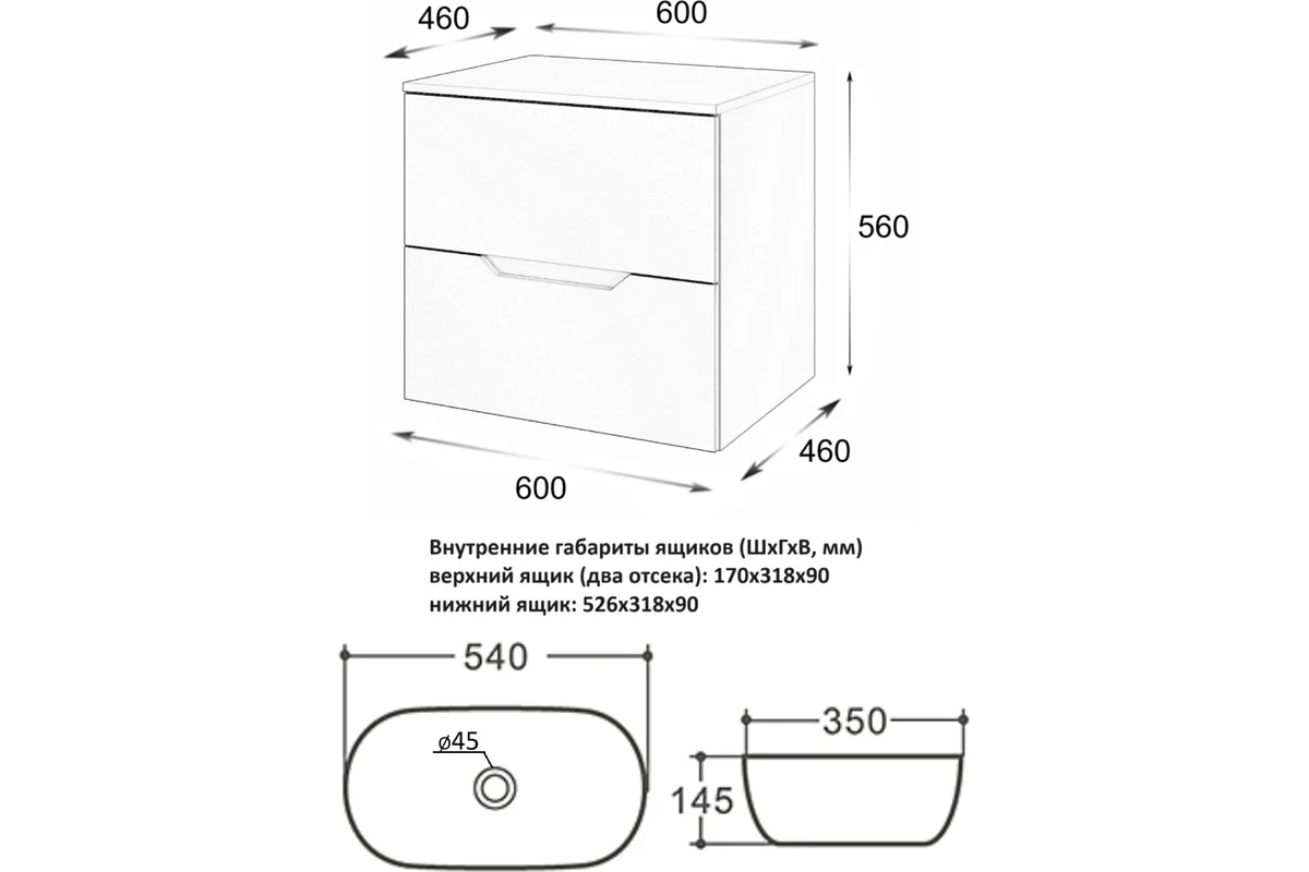 Тумба Orange Line Li-60TuwMDF+B07-540W 60 см, подвесная, белая матовая, с раковиной белой