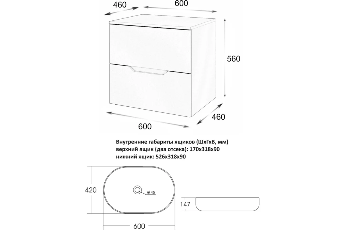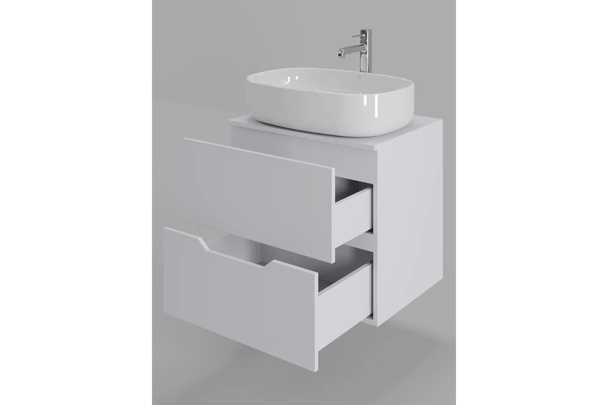 Тумба подвесная с накладной раковиной Orange Line отличается современным дизайном. Изготовлена из МДФ высокой плотности. Мебель покрыта пленкой ПВХ с технологией Soft Touch — ламинация класса премиум, с повышенными тактильными свойствами. Пленка обеспечивает дополнительную защиту мебели от влаги и перепадов температуры. На ящики установлены комплекты скрытых направляющих Hettich, обеспечивающие полное выдвижение и имеющие встроенную систему плавного и бесшумного закрывания. Исполнение - матовое. Материал раковины - фарфор. Отверстия в столешнице под раковину и смеситель монтируются самостоятельно.