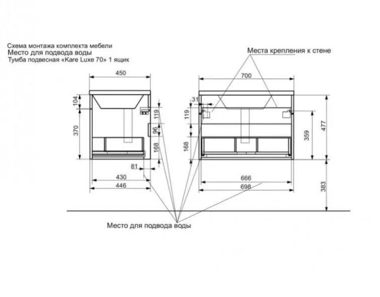 - Габариты раковины (ШxГxВ): 70x45x14,2 см.