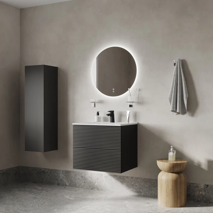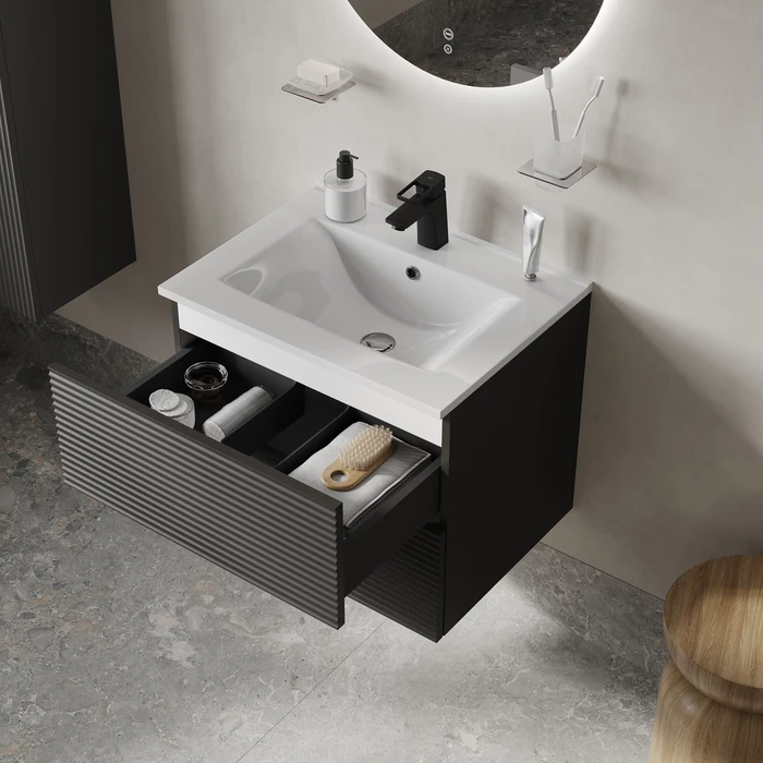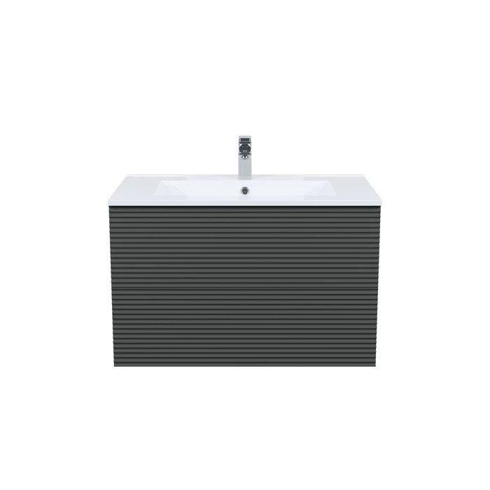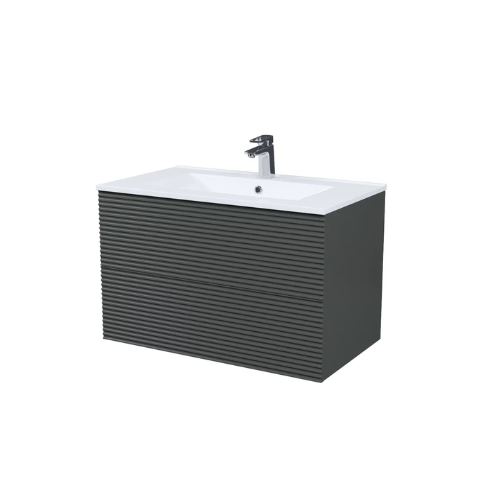 Вместительная подвесная тумба для ванной комнаты Bild с умывальником и выдвижными ящиками – красивый дизайн с трендовой горизонтальной фрезеровкой в сочетании с популярным темно-серым цветом, удобством и практичностью. Материал фасадов – МДФ с покрытием ПВХ-пленкой. Она разработана для использования в помещениях с высокой влажностью и сохранит первоначальный вид мебели надолго (при должном уходе). Материал боковин – МДФ.