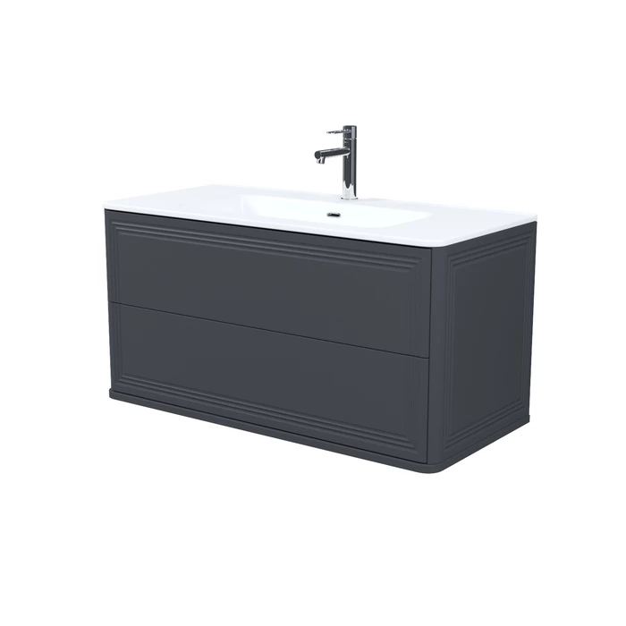 Вместительная подвесная тумба Oxford Neo с умывальником и выдвижными ящиками в элегантном стиле нео-классика с изящной фрезеровкой на фасадах и торцах. Идеально дополнит современные и классические интерьеры и станет настоящим украшением ванной. При желании тумбу можно сделать напольной – ножки высотой 30 см продаются отдельно в трёх цветах (белый, чёрный и светлый бук). Материал фасадов и боковин – МДФ с покрытием тёмно-серой матовой эмалью (RAL7015). Продумано для использования в помещениях с высокой влажностью и сохранит первоначальный вид мебели надолго (при должном уходе). Керамический умывальник с высоким бортом и большой вместительной чашей в комплекте. Удобен для гигиенических и хозяйственных нужд. Два ящика с шариковыми направляющими скрытого монтажа Hettich. Фурнитура рассчитана на 30 000 открываний – это более 10 лет исправной работы. Современный механизм открытия Push-to-Open – ящики открываются нажатием на фасад. В комплекте регулируемые навесы Hettich для удобного монтажа тумбы. Сифон приобретается отдельно. Гарантия на мебель IDDIS® – 3 года, на умывальник – 5 лет.