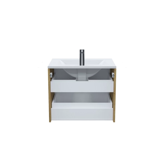 Компактная подвесная тумба для ванной комнаты Bild с умывальником и ящиками – красивый дизайн со структурной горизонтальной фрезеровкой в сочетании с теплым оттенком дуба, удобством и практичностью. - Материал фасадов – МДФ с покрытием ПВХ-пленкой. Она разработана для использования в помещениях с высокой влажностью и сохранит первоначальный вид мебели надолго (при должном уходе). Материал боковин – ЛДСП. - Керамический умывальник с высоким бортом и большой вместительной чашей в комплекте. Удобен для гигиенических и хозяйственных нужд. - Два ящика с направляющими скрытого монтажа с доводчиком Hettich. Фурнитура рассчитана на 30 000 открываний – это более 10 лет исправной работы. - Современный механизм открытия Push-to-Open – открывается нажатием на фасад. - В комплекте крепеж для монтажа тумбы. - Сифон приобретается отдельно. Гарантия на мебель IDDIS® – 3 года, на умывальник – 5 лет.