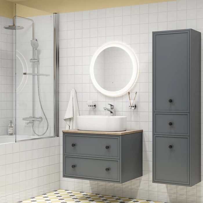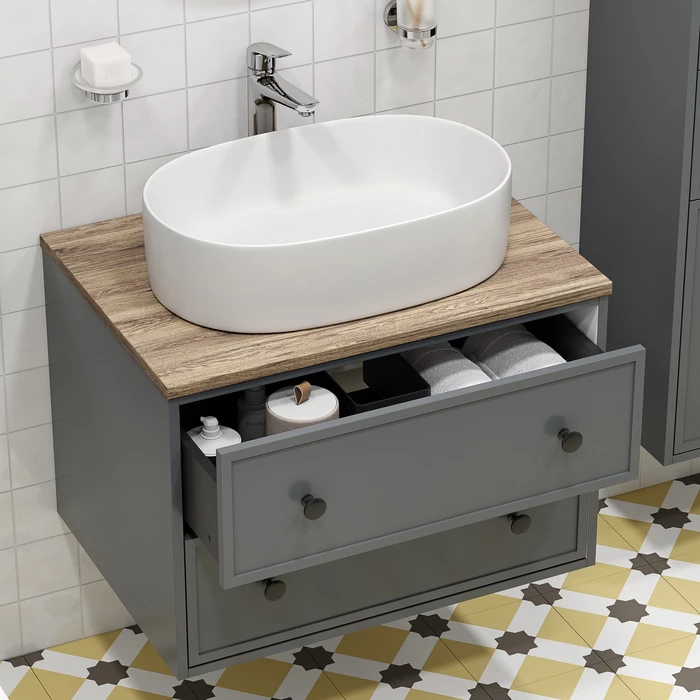 Два просторных выдвижных ящика закрываются плавно и бесшумно благодаря высококачественным скрытым направляющим с доводчиками Hettich. Внутри ящики графитового цвета – стильно и практично. Покрытие качественной влагостойкой пленкой, разработанной для использования в помещениях с высокой влажностью, сохранит первоначальный вид мебели надолго (при должном уходе).