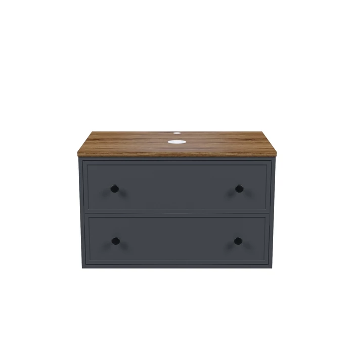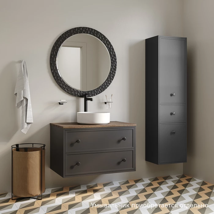 Два просторных выдвижных ящика закрываются плавно и бесшумно благодаря высококачественным скрытым направляющим с доводчиками Hettich. Внутри ящики графитового цвета – стильно и практично. Покрытие качественной влагостойкой пленкой, разработанной для использования в помещениях с высокой влажностью, сохранит первоначальный вид мебели надолго (при должном уходе).