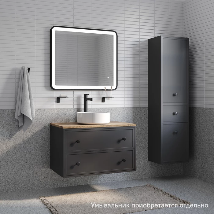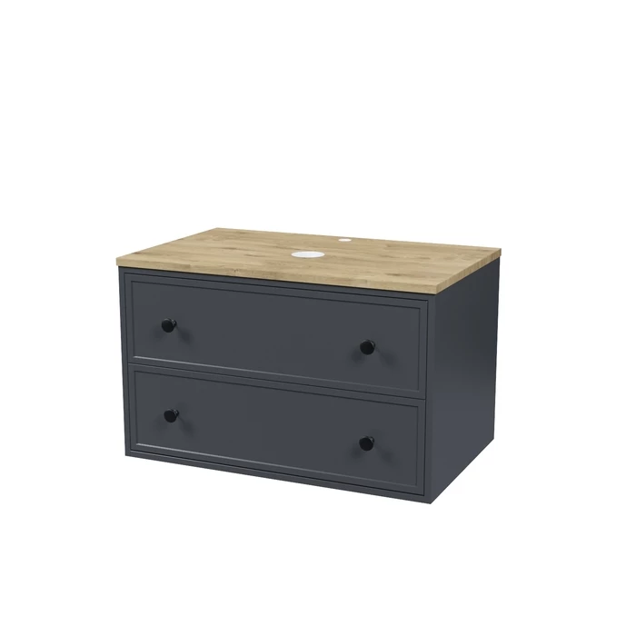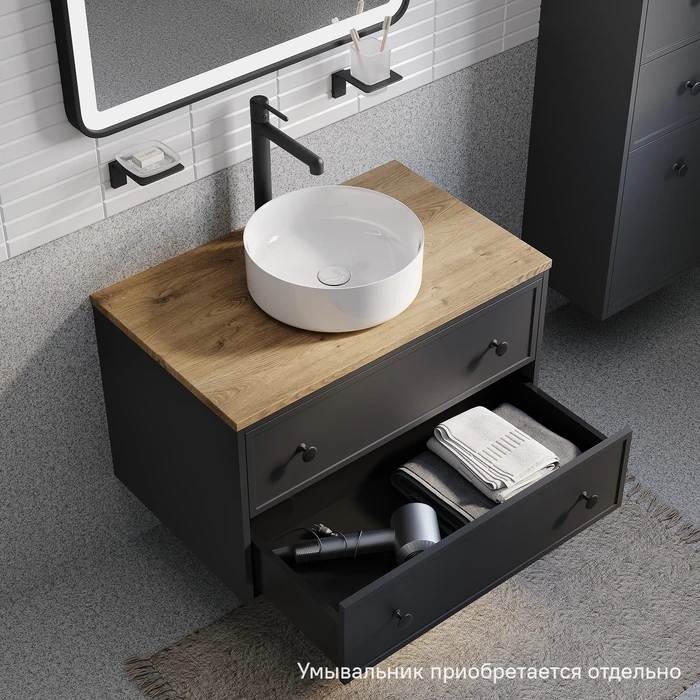 Вместительная подвесная тумба Torr трендового темно-серого цвета со столешницей из МДФ в оттенке дуба верона. Сочетает в себе узнаваемый стиль и практичность популярного скандинавского дизайна. Ее четкие формы, теплый цвет дерева, фасады с декоративной филенкой, круглые ручки смотрятся гармонично и впишутся в любой современный интерьер. Подойдет любой накладной умывальник, покупается отдельно.