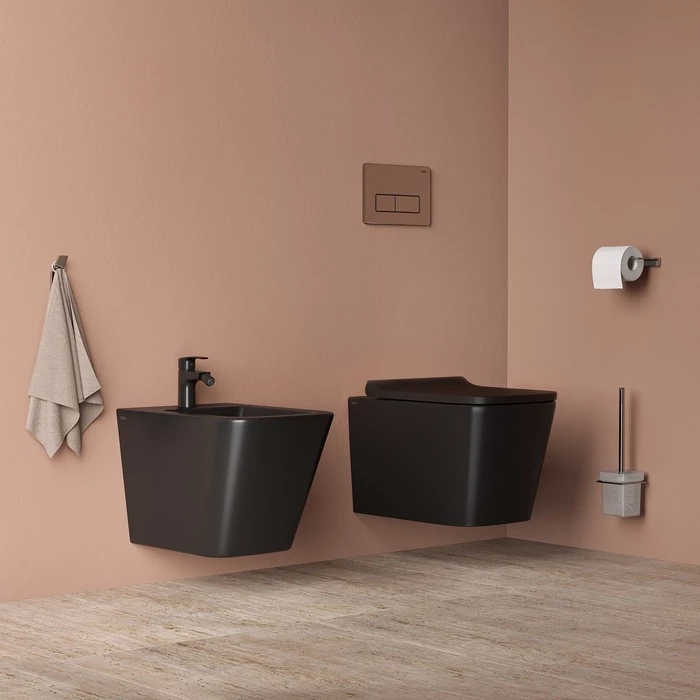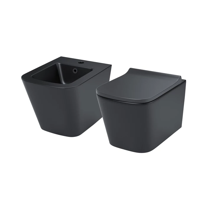 Комплект подвесной керамики Bild в трендовом матовом черном цвете: унитаз и биде в минималистичном дизайне с прямоугольными гранями. Позволит оформить ванную в едином стиле с комфортом и эстетикой. Удобное продуманное решение и выгодная покупка.