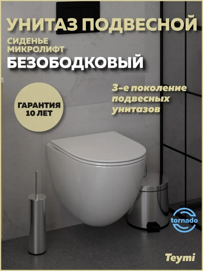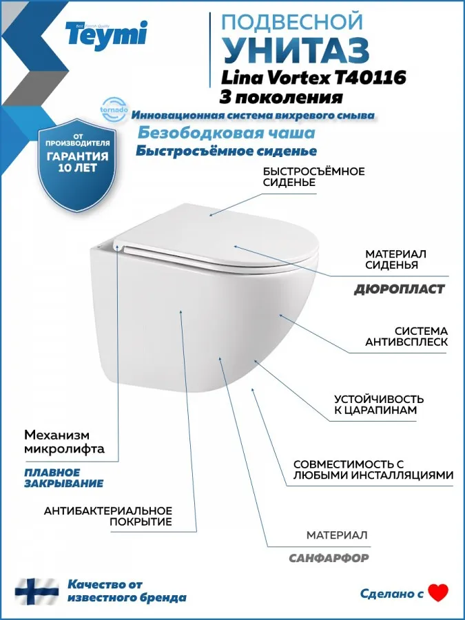 - Унитаз предназначен для монтажа на любую стандартную систему инсталляции и поставляется с полным комплектом креплений. Качество и надежность подтверждены 10-летней гарантией от бренда Teymi. Lina Vortex — это выбор для тех, кто ценит безупречную гигиену, передовые технологии и современную эстетику в ванной комнате.