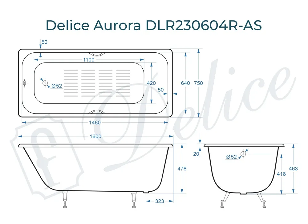 Для установки используются фирменные ножки Delice, которые имеют надежное и прочное крепление, обеспечивают высокую устойчивость ванны и регулируются по высоте. Высота на ножках варьируется от 60.8 до 65.8 см. Ножки выполнены из высокопрочного чугуна марки СЧ25, который выдерживает большие нагрузки. Для модели Aurora подходит свой комплект ножек - артикул DLR000012.