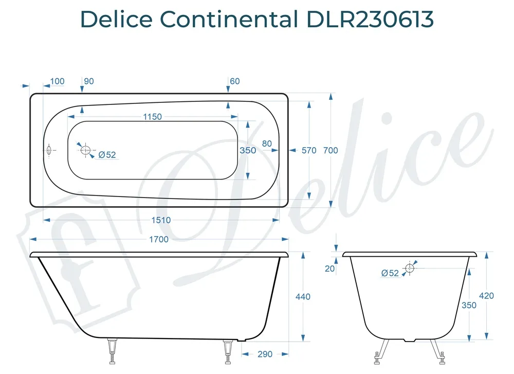 Для установки используются фирменные ножки Delice, которые имеют надежное и прочное крепление, обеспечивают высокую устойчивость ванны и регулируются по высоте. Высота на ножках варьируется от 55 до 61 см. Ножки выполнены из высокопрочного чугуна марки СЧ25, который выдерживает большие нагрузки. Для модели Continental подходит комплект ножек для серии Elite - артикул DLR000033.
