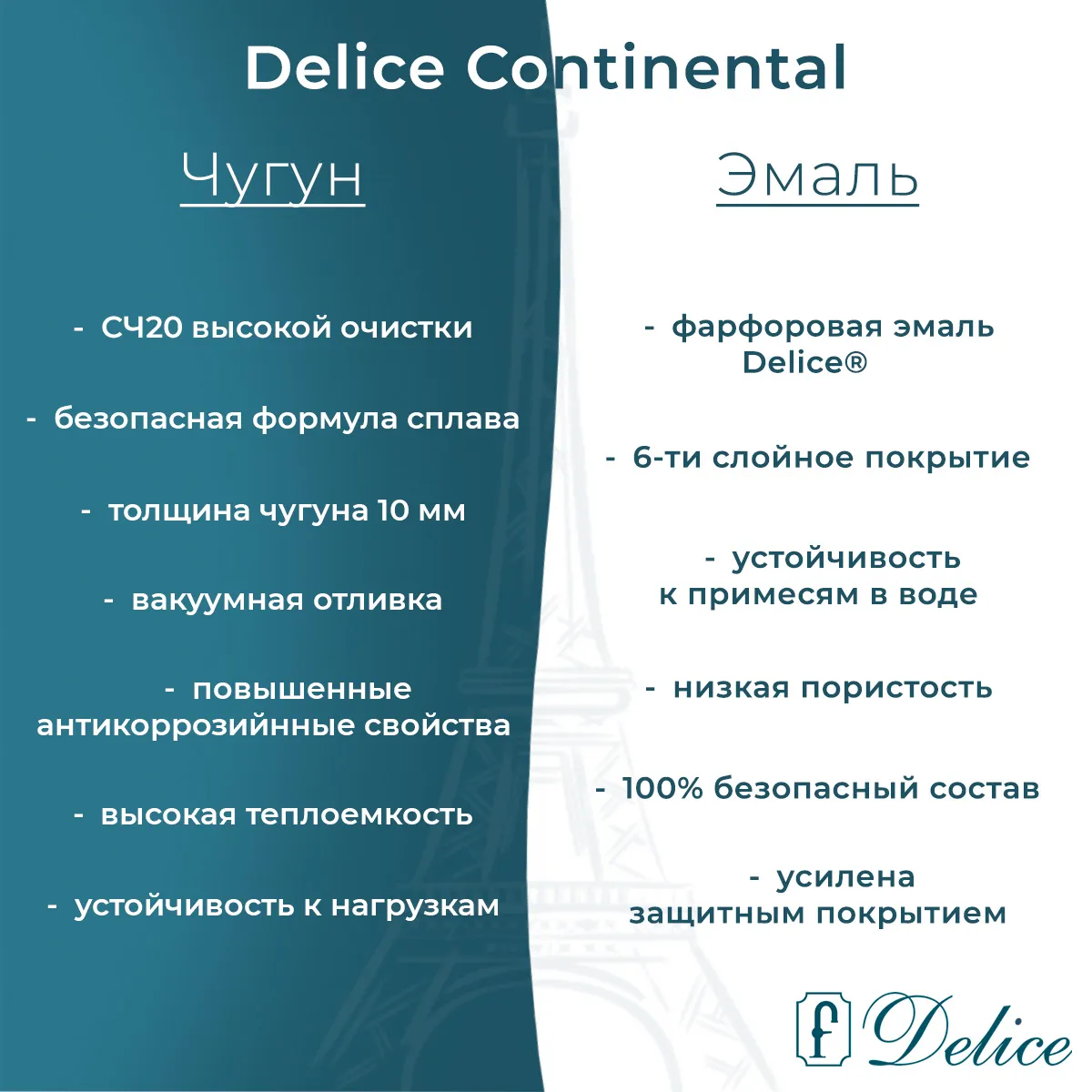 Ванна производится из модифицированного низколегированного серого чугуна по технологии, разработанной компанией Delice. Используемое сырье проходит тщательную очистку, из него удаляются вредные и опасные примеси, которые содержатся в железной руде (сера, фосфор, мышьяк, цинк, свинец и щелочные металлы). Также на этом этапе происходит удаление воды, молекулы которой могут повлиять на качество готового изделия. В процессе производства чугун подвергается легированию (добавлению элементов, улучшающих его свойства), в результате получается сплав, имеющий уникальные свойства: