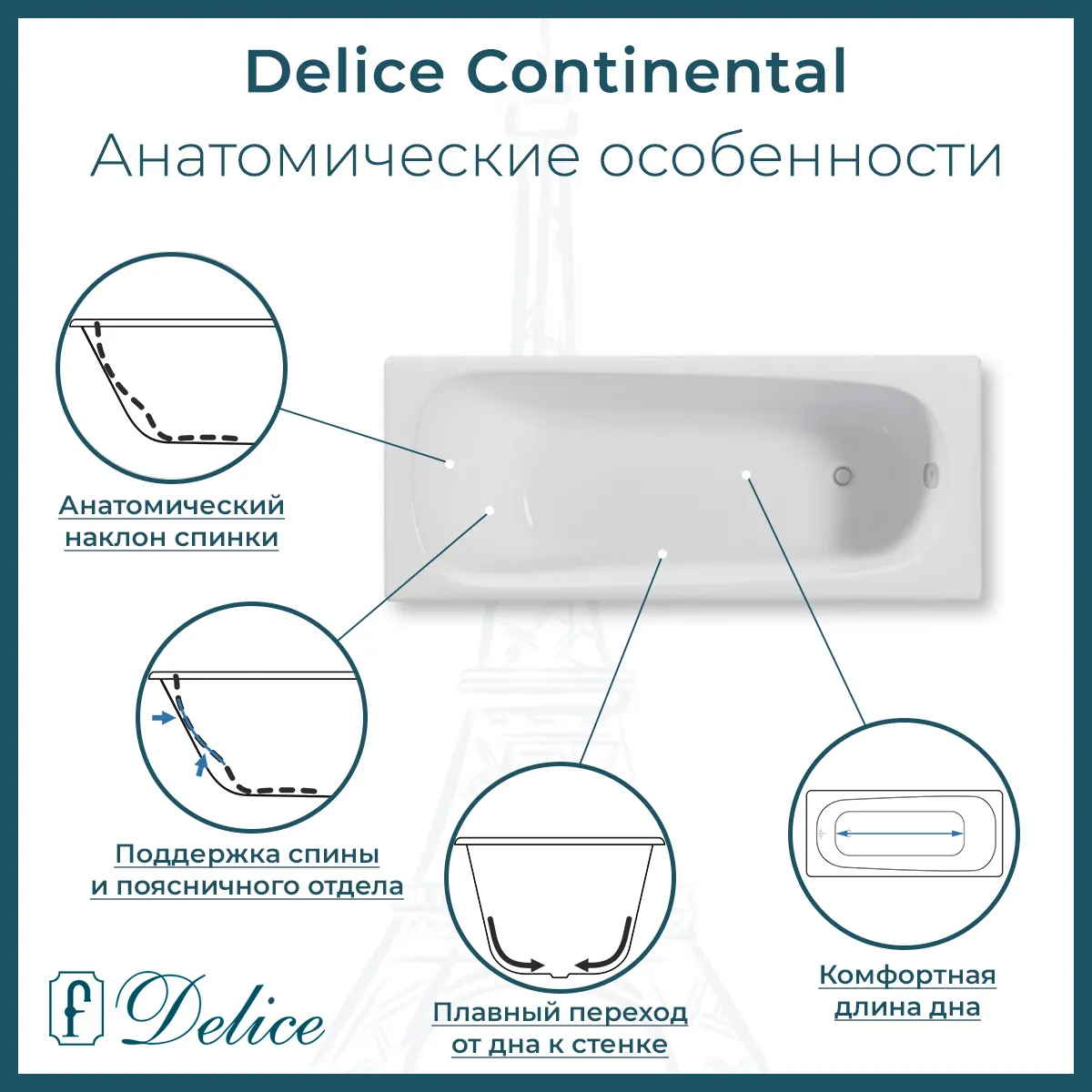 Для установки используются фирменные ножки Delice, которые имеют надежное и прочное крепление, обеспечивают высокую устойчивость ванны и регулируются по высоте. Высота на ножках варьируется от 55 до 61 см. Ножки выполнены из высокопрочного чугуна марки СЧ25, который выдерживает большие нагрузки. Для модели Continental подходит комплект ножек для серии Elite - артикул DLR000033.