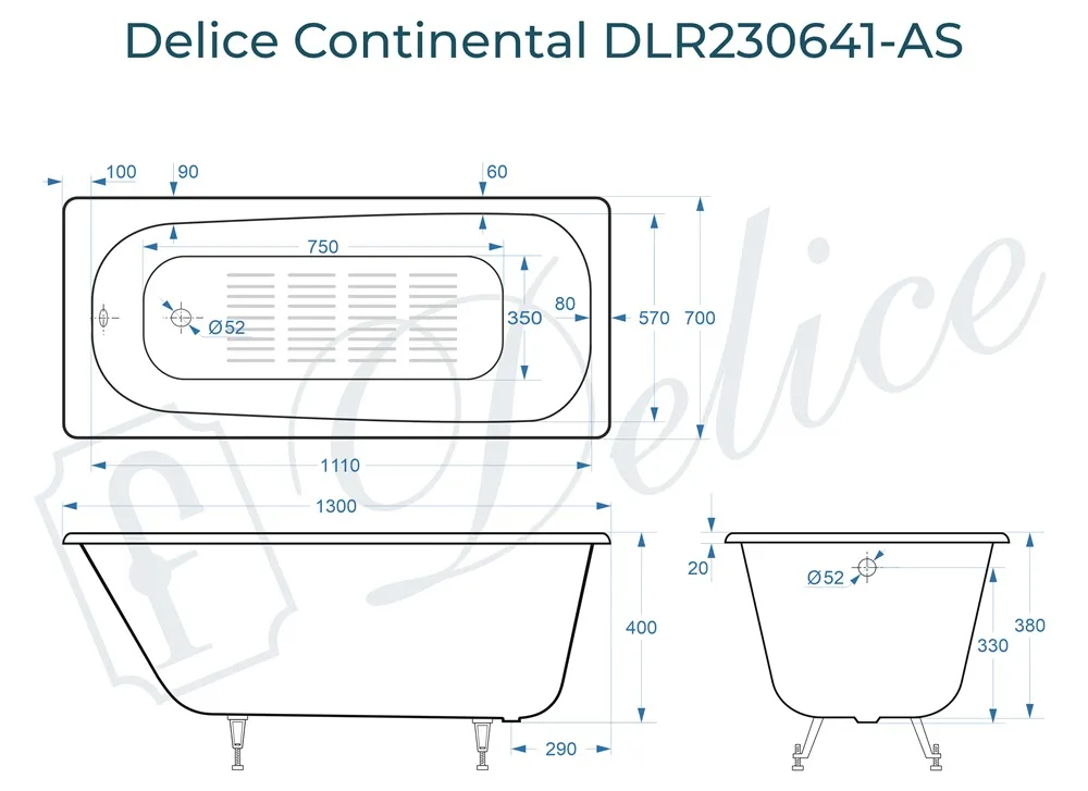 Описание чугунной ванны Delice Continental 130х70 с антискользящим покрытием