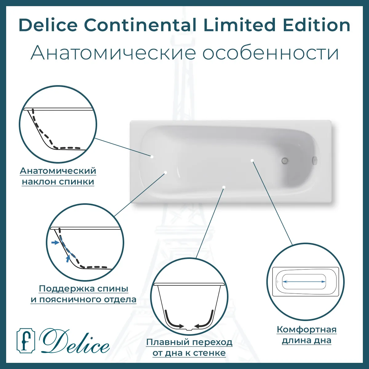 Для установки используются фирменные ножки Delice, которые имеют надежное и прочное крепление, обеспечивают высокую устойчивость ванны и регулируются по высоте. Высота на ножках варьируется от 56 до 60.5 см. Ножки выполнены из высокопрочного чугуна марки СЧ25, который выдерживает большие нагрузки. Для модели Continental Limited Edition подходит комплект ножек для серии Elite - артикул DLR000002.