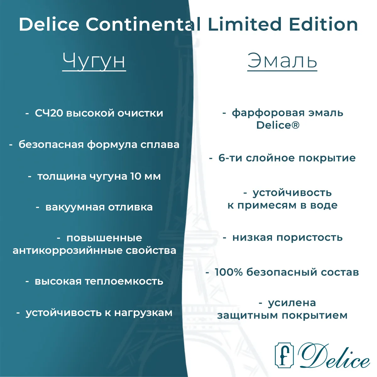 Все наши ванны покрыты уникальной фирменной эмалью Delice, произведенной по разработанной компанией формуле, которая имеет уникальные эксплуатационные характеристики. Формула эмали разрабатывалась специально для нанесения многослойного покрытия на чугунные ванны.